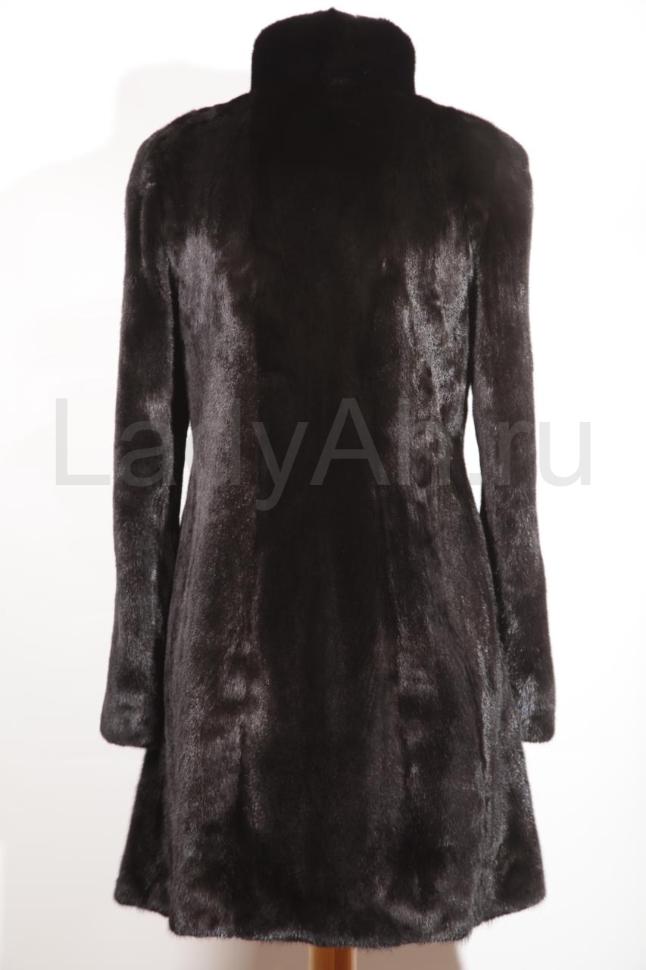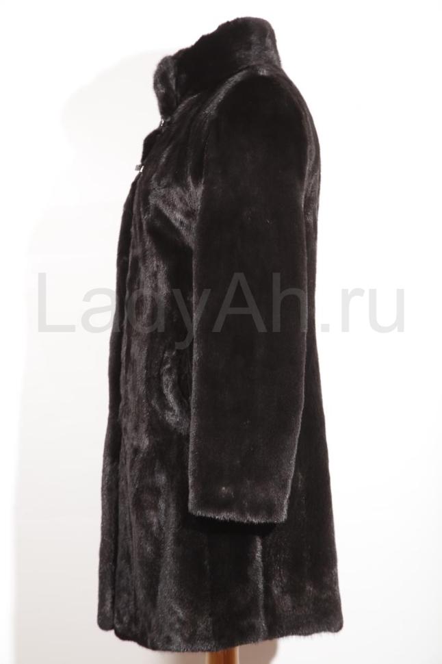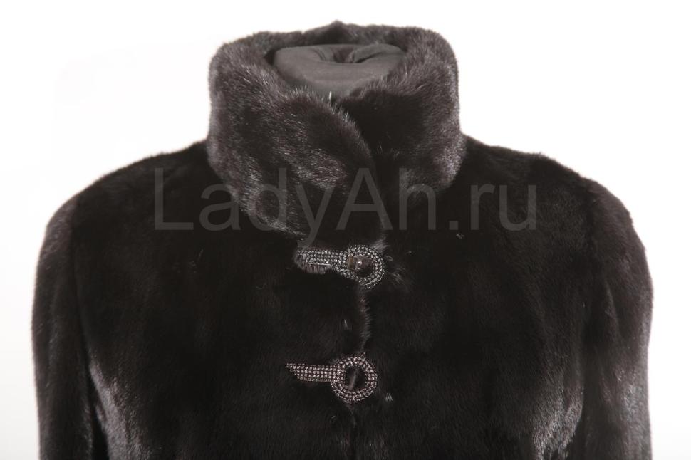 Изящное норковое пальто прямого кроя с воротником стойкой и мерцающей фурнитурой. Мех густой, коротко-остный, струящийся, с глянцевым блеском.