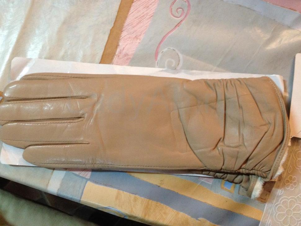 Кожаные перчатки с утеплителем нежного бежевого оттенка, слегка присборенные к низу. Длина стандартная. Прекрасный и полезный зимний аксессуар для истинной леди.