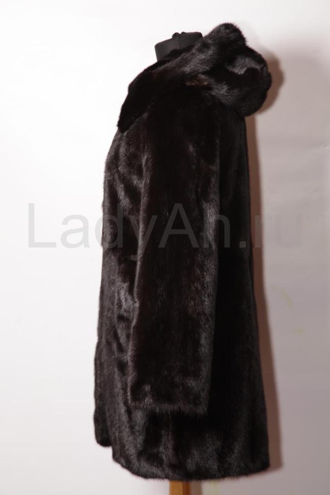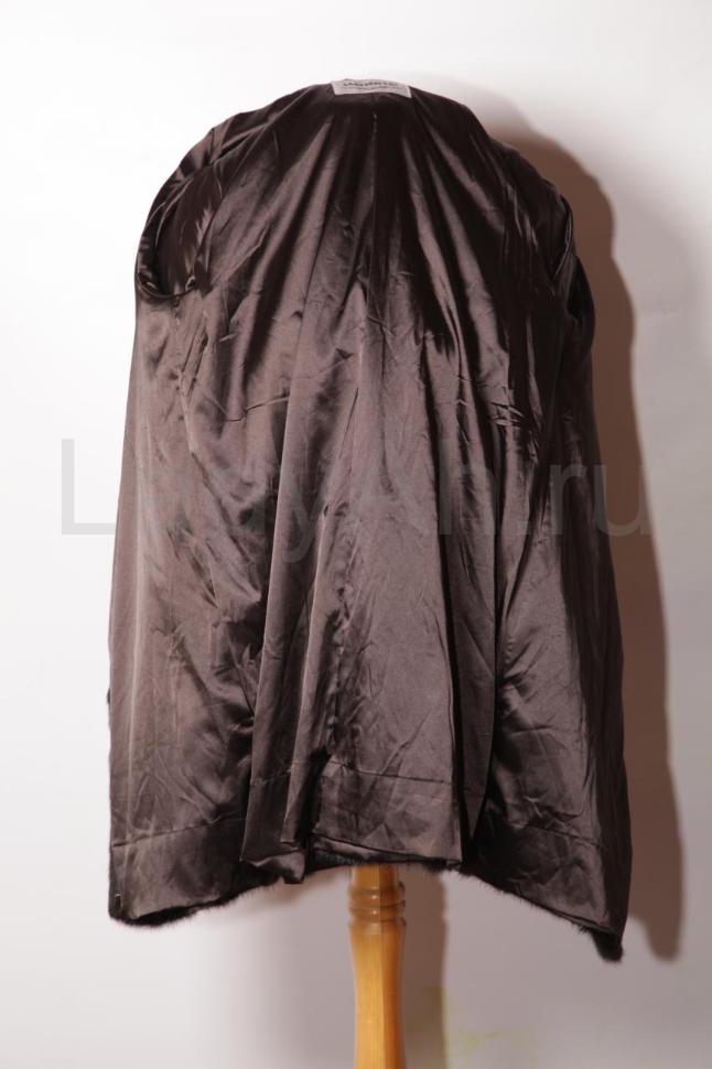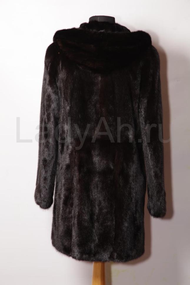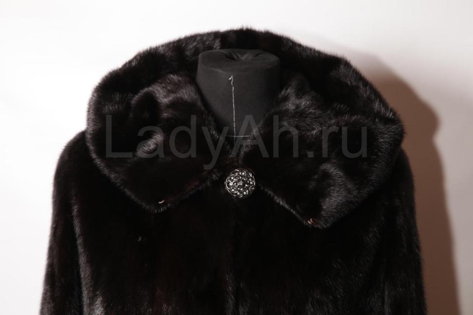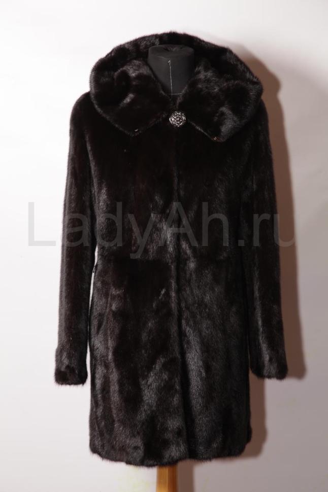 Цельная норковая шуба, фасон прямой. В данном изделии предусмотрен меховой пояс, но он отсутствует.