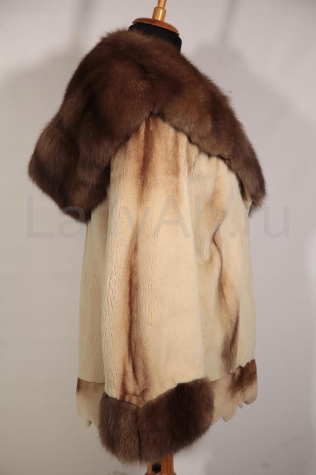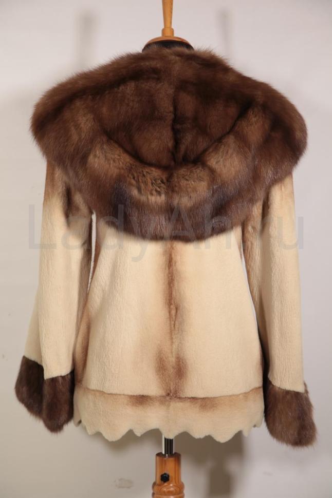 Отдельного внимания заслуживает цвет: на мягкой подпуши оттенка слоновой кости вертикальной россыпью расположились искристые остевые волоски орехового оттенка. Полушубок выполнен из полустриженной норки (местами оставлен остевой волос, отчетливо видно, что это норка).