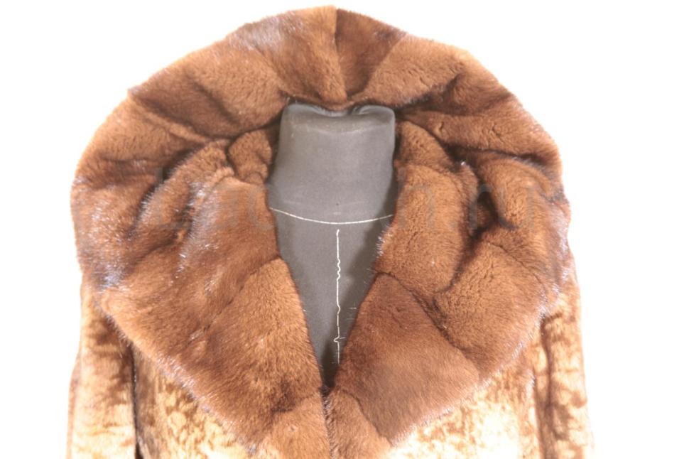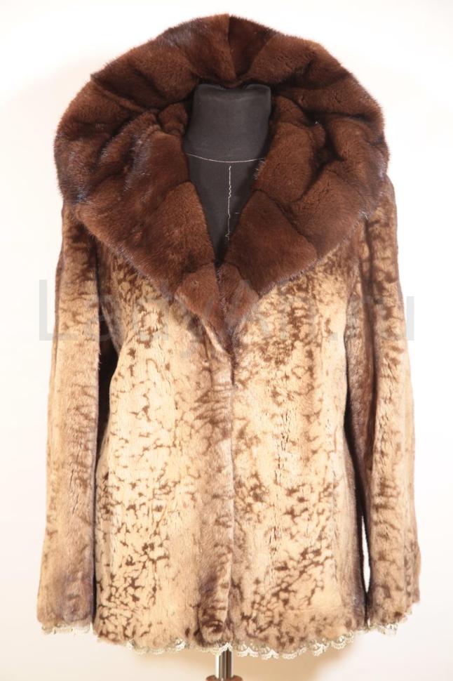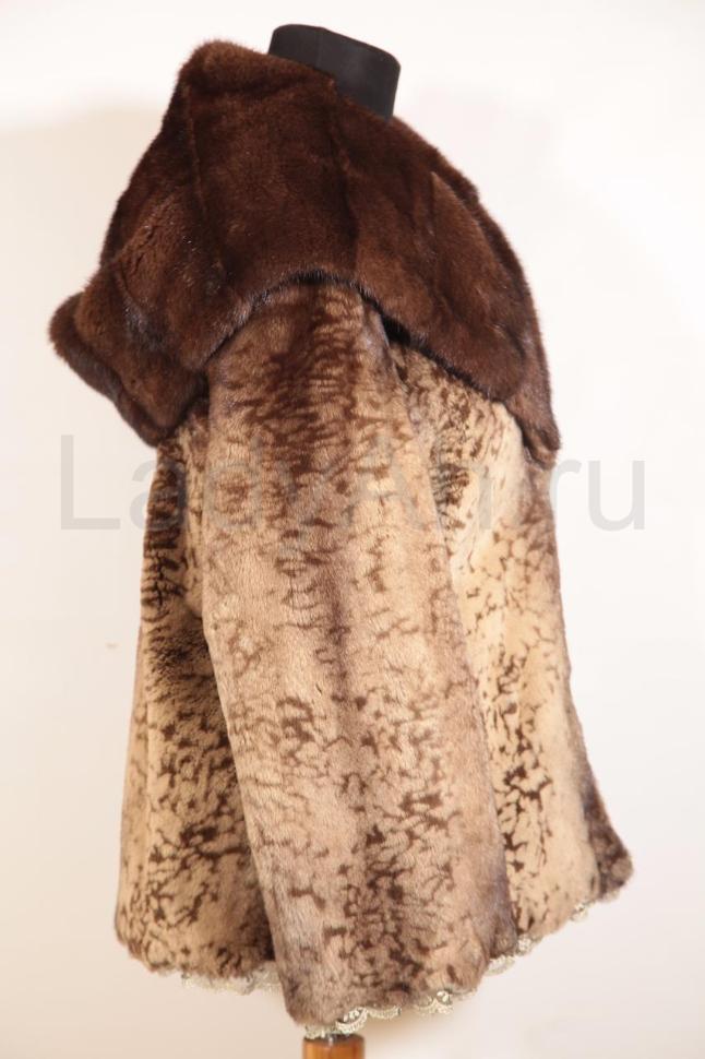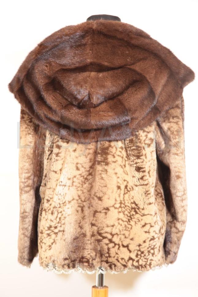 Норковый полушубок прямого фасона с изумительным абстрактным принтом (см. фото). Увенчан капюшоном "коброй" из яркой короткоостной норки орехового цвета. На рукавах и по подолу полушубка женственные кружевные детали, отделка кружевом и бисером.