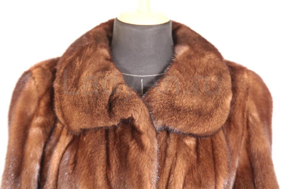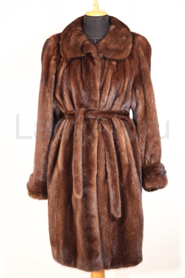 Норковая шуба прямого кроя, с полукруглым отложным воротом. Рукава с отворотами. Талия подчеркнута норковым поясом. Изумительный насыщенный ореховый оттенок, изобилие меха высокого качества выделки (маркировка Kopenhagen Fur).