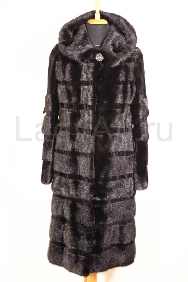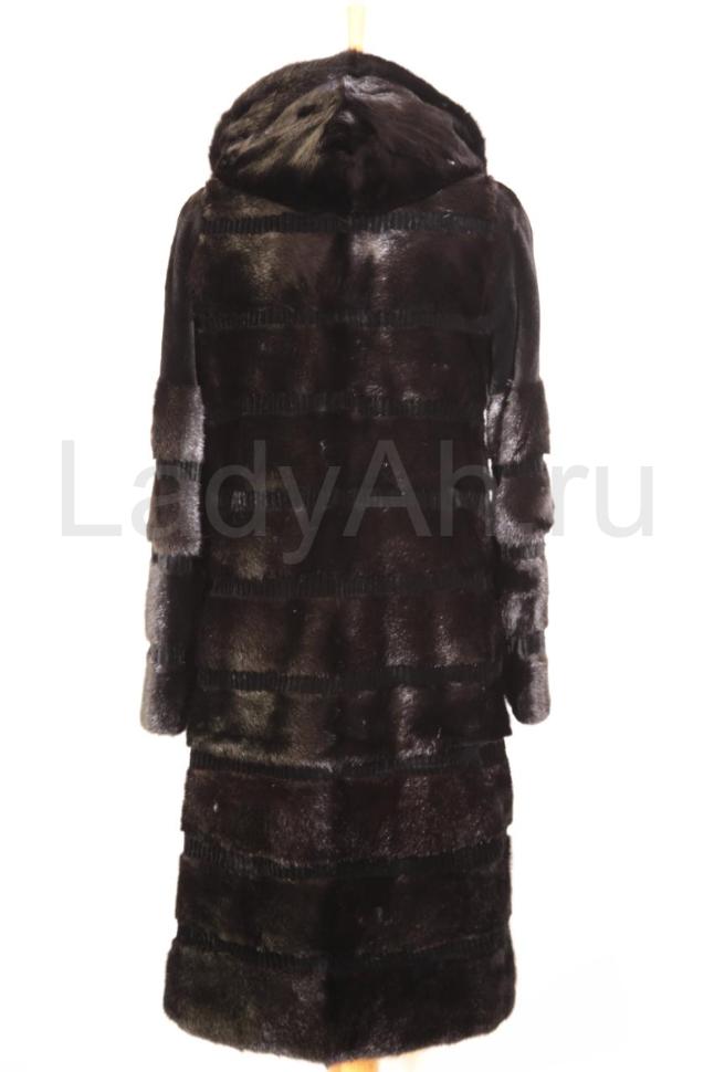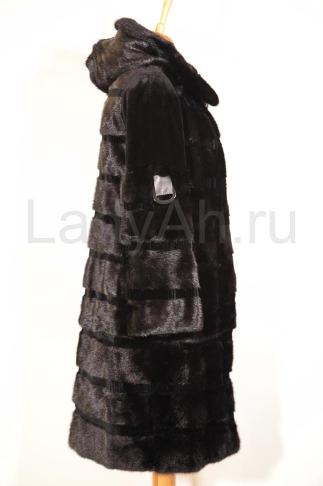 Норковая шуба прямого кроя в модной поперечной выкладке меха. Удобный и функциональный капюшон спасет от непогоды и послужит отличной альтернативой головному убору. Интересная деталь: между пластинами поперечной выкладки находятся маленькие пластинки перфорированной стриженной норки в тон, добавляя урбанистическую нотку образу.