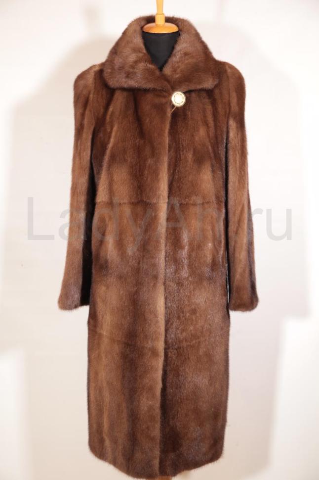 Норковая шуба из крупных цельных пластин, с воротом апаш. Крой классический, цвет мягкий и желанный- орех.