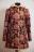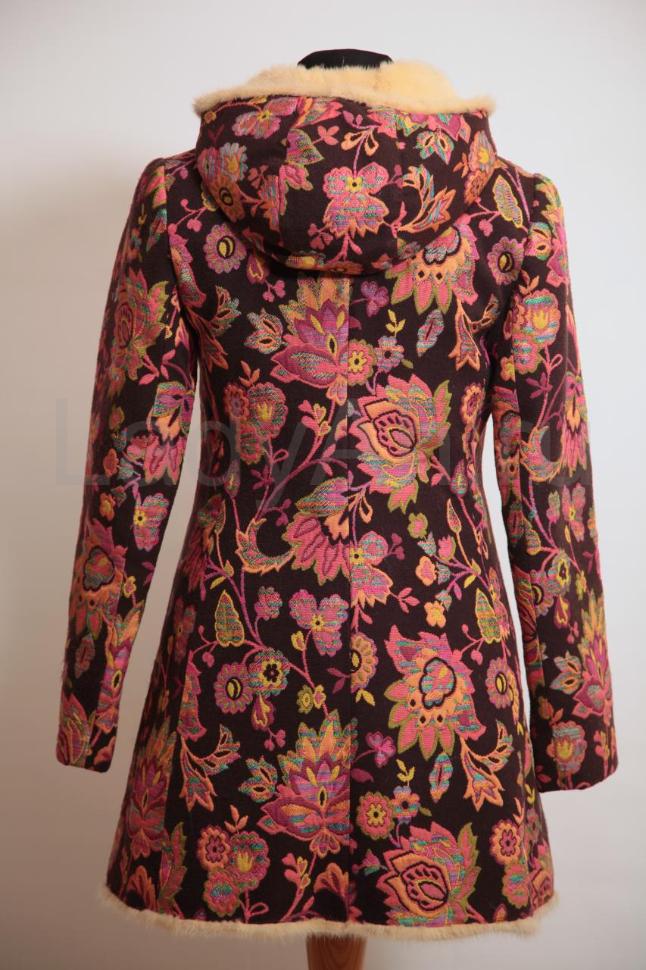 Удлиненный норковый полушубок из светлой жемчужной норки мехом внутрь, сверху же выполнен из плотной влагостойкой пальтовой ткани. Одельного внимания заслуживает цвет: бодрящие и создающие настроение ягодные тона с изумительным растительным узором. Смотрится в меру ярко и экстравагантно.