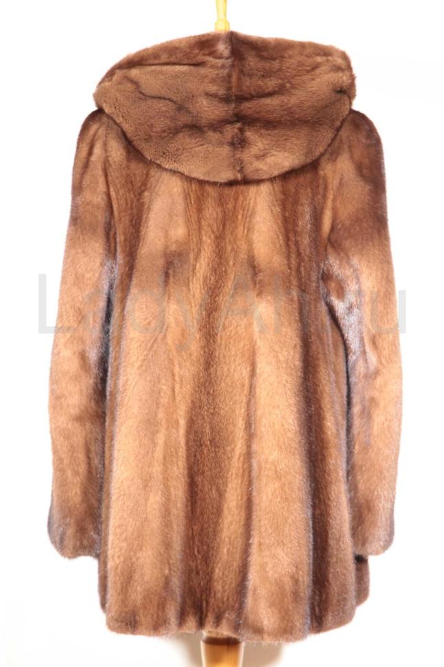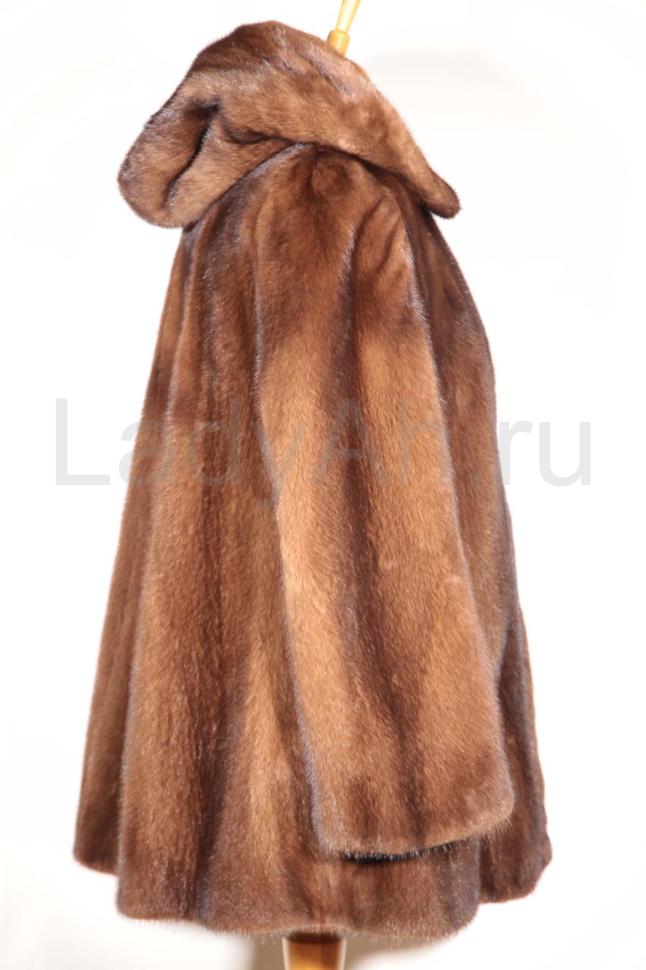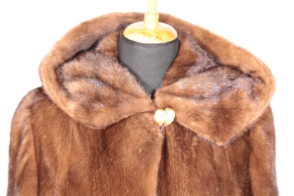 Норковый полушубок с капюшоном с отворотом, благородного цвета орех.