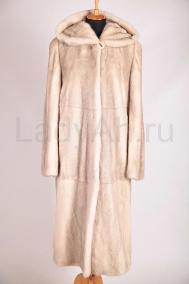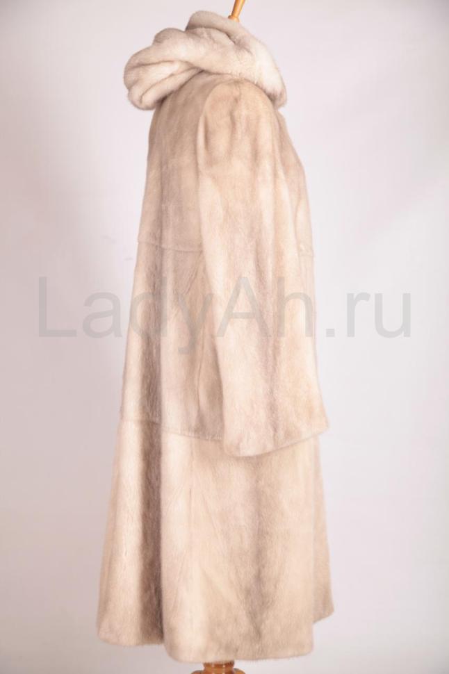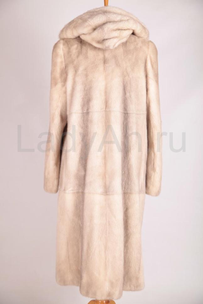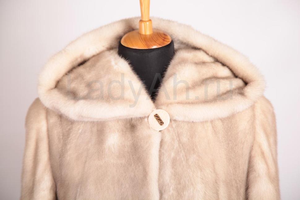 Норковая шуба с капюшоном, крой прямой. Цельная выкладка меха, четкая посадка по фигуре. Меха много: густого, с короткой остью и богатой подпушью. Оттенок шубы в меру нарядный, достаточно светлый, с россыпью чуть золотистых остевых волосков на полотне контрастной ванильной подпуши.