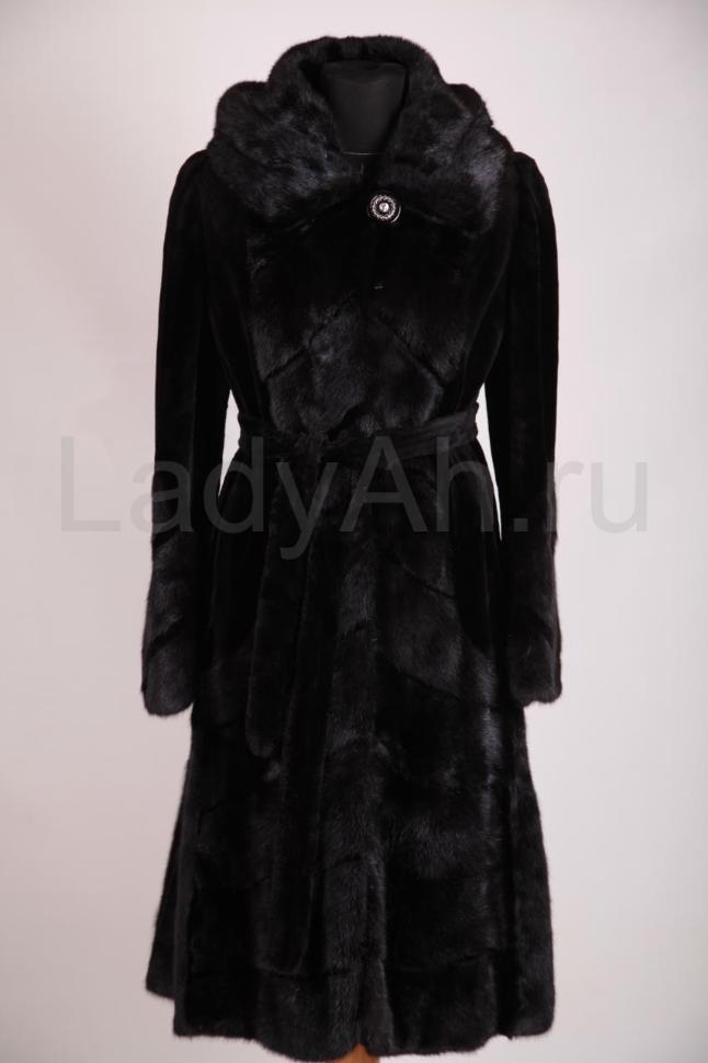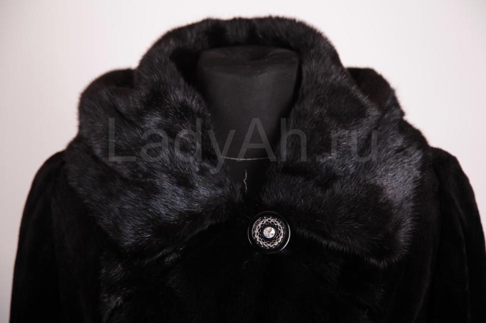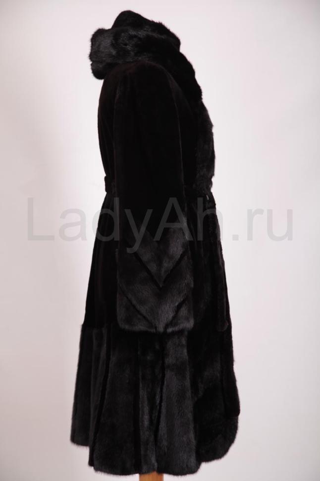 Норковая шуба летящего и женственного силуэта, на основе стриженой норки, с капюшоном и отделкой из нестриженой норки, отделкой на подоле из нестриженой норки в тон. Мех мягчайший, бархатистый, густого, всепоглощающего черного оттенка. Кропотливая и тщательная выкладка меха, изумительный и эксклюзивный крой (см. фото). Мех визуально похож на Блекгламу.