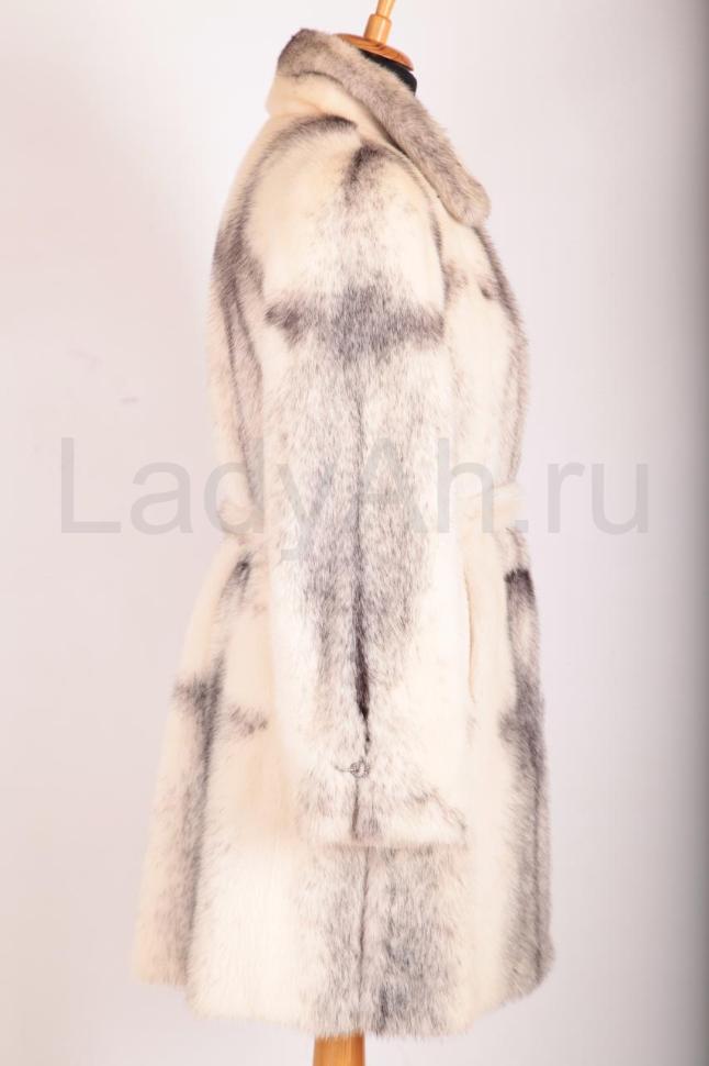 Норковая шубка прямого фасона из норки крестовки. Талия подчеркнута норковым поясом. Ворот апаш. Мех густой, набивной, очень плотный и блестящий. Статусная и невероятно женственная вещь в коллекцию истинной ценительницы прекрасного. Сшита цельными пластинами.