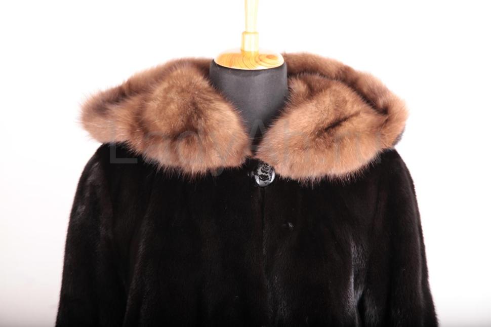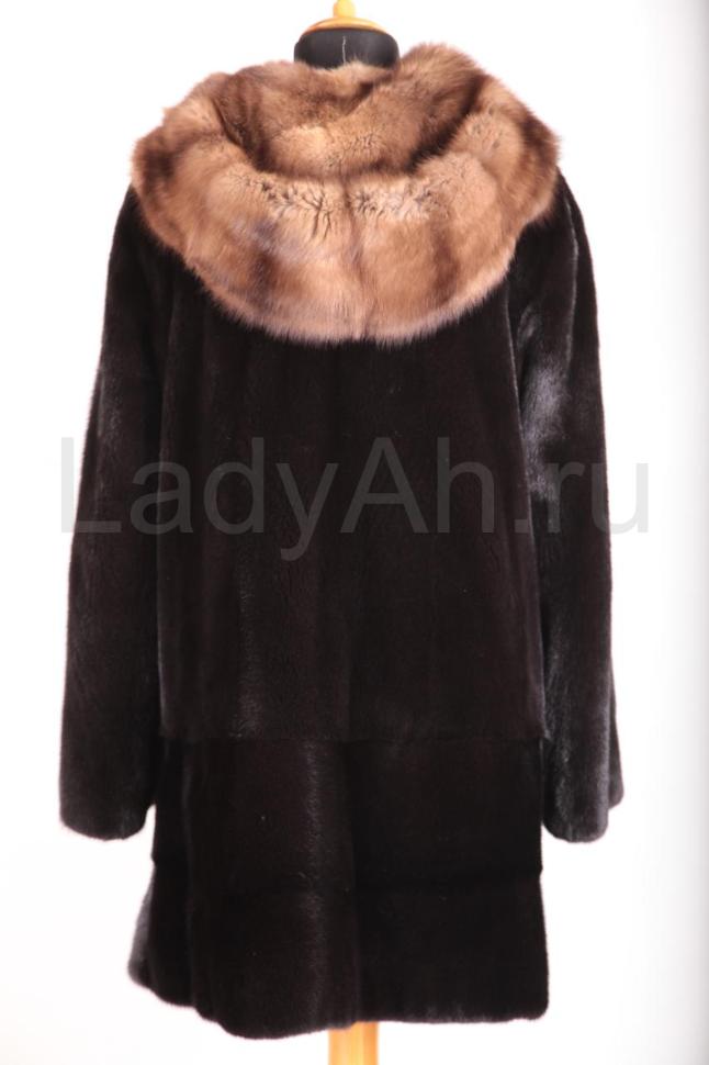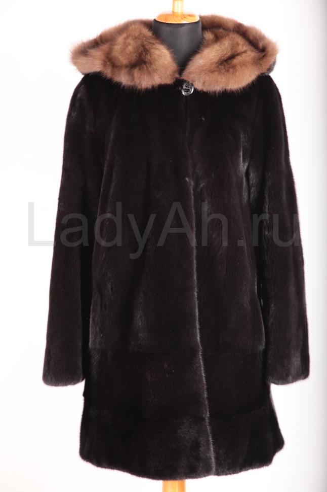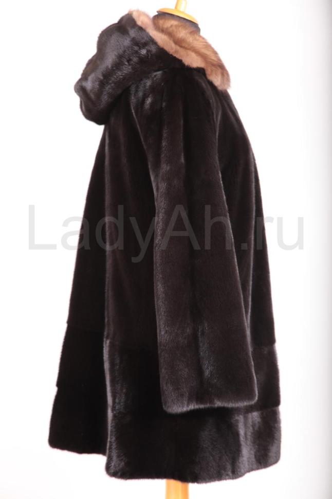 Норковая шуба трапецивидного силуэта с роскошным объемным капюшоном, отделанным отборным соболем. Мех