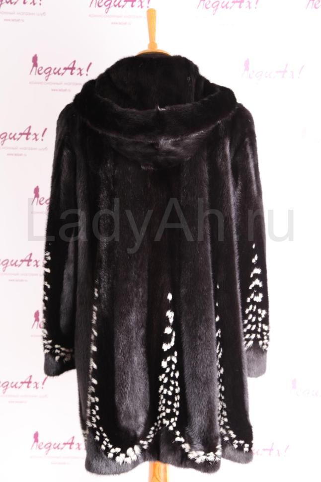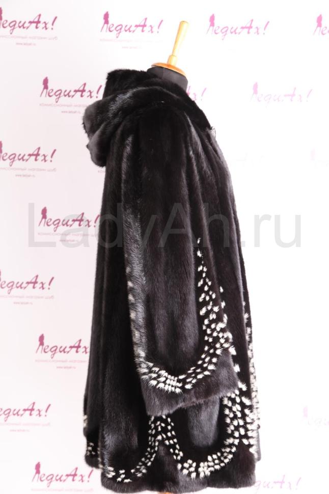 Великолепная норковая шуба из аукционной норки, фасон трапеция, с удобным капюшоном с отворотом. Цвет черный бриллиант, комбинированная вставками пластин перевертышей (остевым волоском вверх). По низу шубка с интарсией пятнышками белой норки - смотрится по-королевски. Мех норки мягчайший и бархатный, окутывает свою хозяйку словно роскошная мантия.
