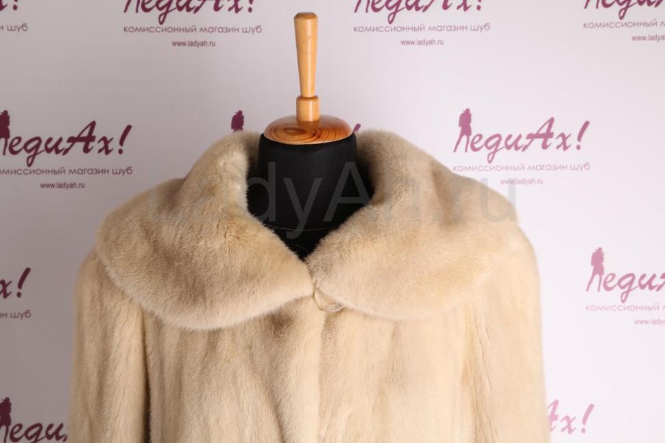 Норковая шуба летящего фасона трапеция, с фалдами, воротник полукруглый отложной. Нарядный светлый бежевый оттенок, мех шубы коротко-остный, с богатой подпушью. Шуба прекрасно садится по фигуре, выглядит женственно, элегантно и роскошно, подчеркнёт статус и тонкий вкус своей обладательницы.