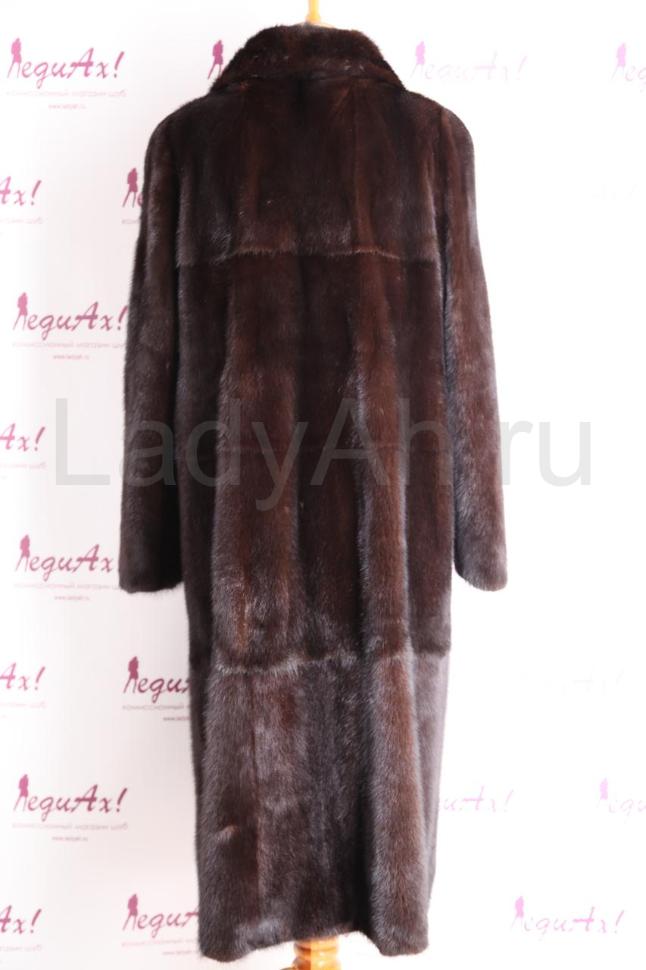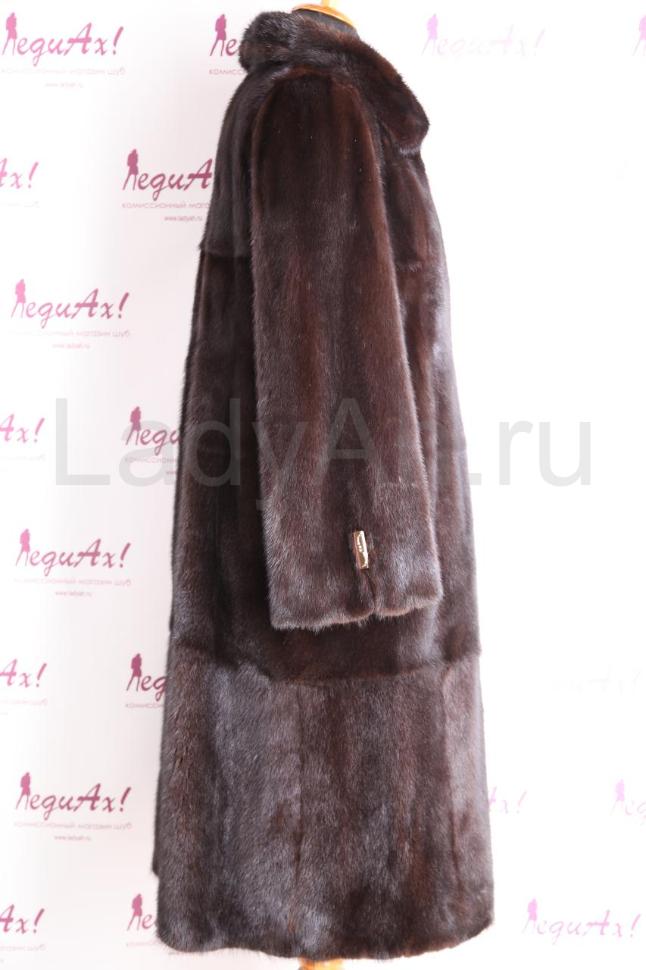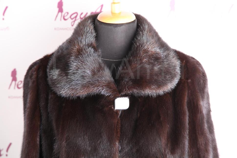 Норковая шуба с полукруглым отложным воротом, комфортной длины. Мех шубы благородный, густой, набивной, с обворожительным блеском. Выделка меха добротная (производство Aris Furs, Греция). Фасон А-силуэт с успехом зрительно "вытянет" фигуру обладательницы, придав стройность и хрупкость.