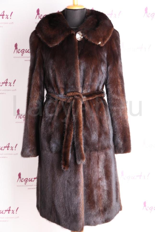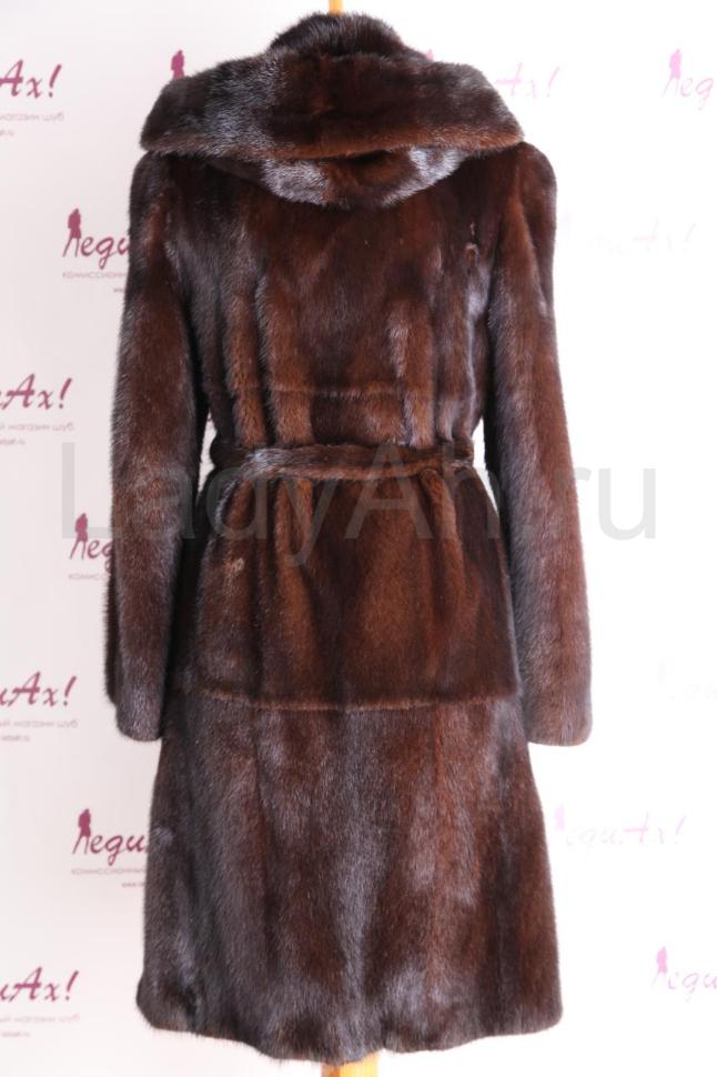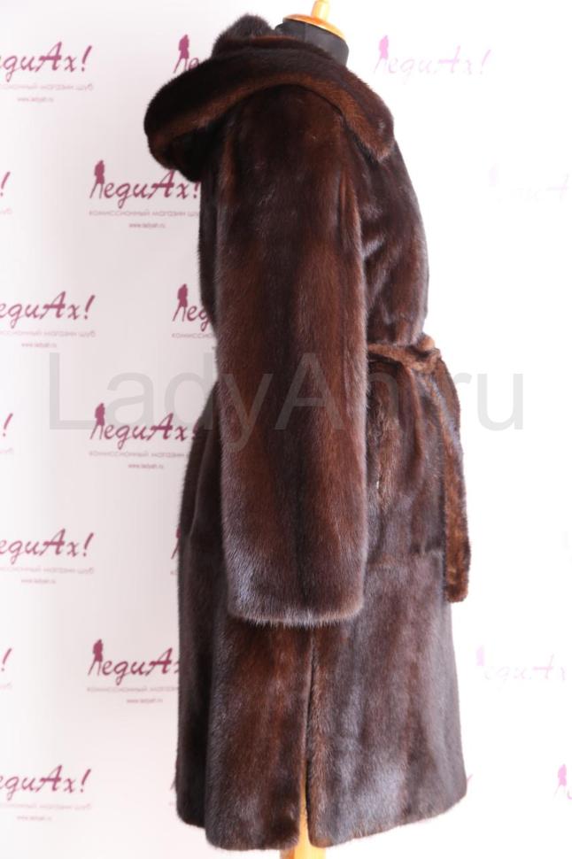 Норковая шуба прямого кроя, с капюшоном. Талия подчеркнута норковым поясом. По бокам шубы разрезы. Мех плотный, густой, очень блестящий. Практичная и красивая шуба на все случаи жизни, настоящая "выручалочка" для своей обладательницы.