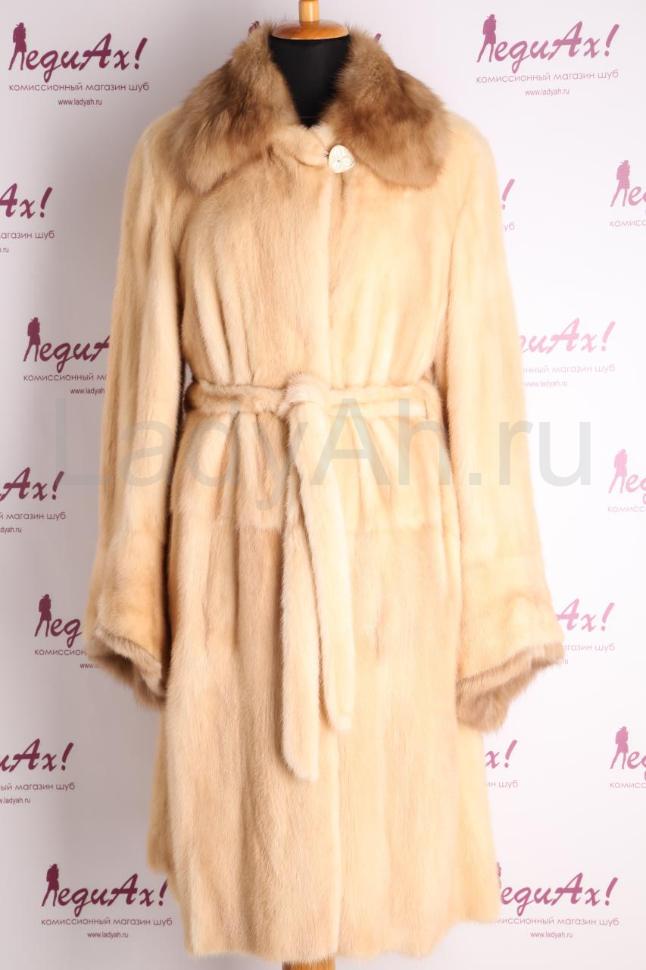 Норковая шуба прямого фасона, воротник апаш из отборной золотой куницы, на рукава также отделка из куницы. Талия подчеркнута норковым поясом. Мех шикарный, добротной аукционной выделки - сияет и блестит драгоценными золотистыми переливами (маркировка Saga Mink). Смотрится дорого, стильно и элегантно и женственно - настоящее украшение зимнего гардероба своей обладательницы.