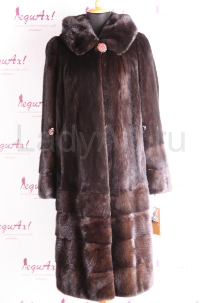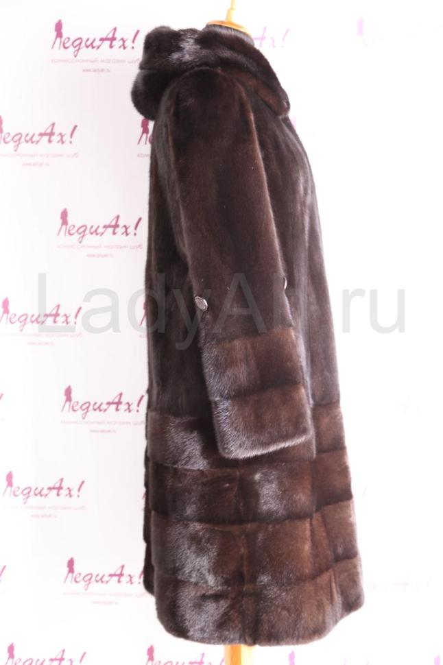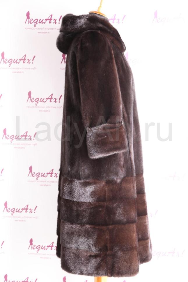 Новая норковая шуба с капюшоном, фасон А-силуэт. Приятный акцент, который придется по вкусу искушенным модницам: низ рукавов и шубы отделан модными и актуальными поперечными пластинами (см. фото). Мех блестящий и струящийся, очень плотный и густой. Прекрасно моделирует силуэт, стройнит. На рукавах, в талии и по подолу есть кулиски. Приятная деталь: с помощью декоративных пуговичек на уровне локтей, длину рукава шубы можно трансформировать в 3/4. Таким образом, используя аксессуары (высокие перчатки, митенки), можно придать шубе нарядный вид, например, для выходов в свет.