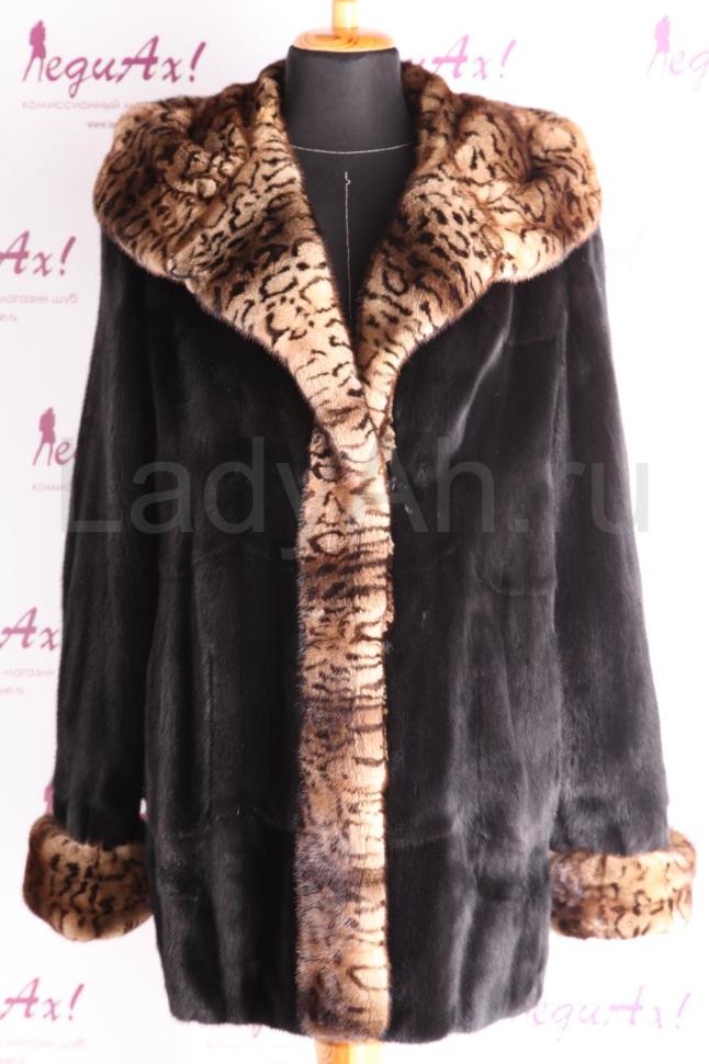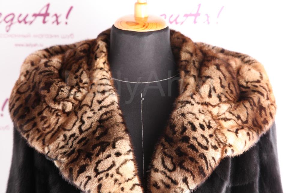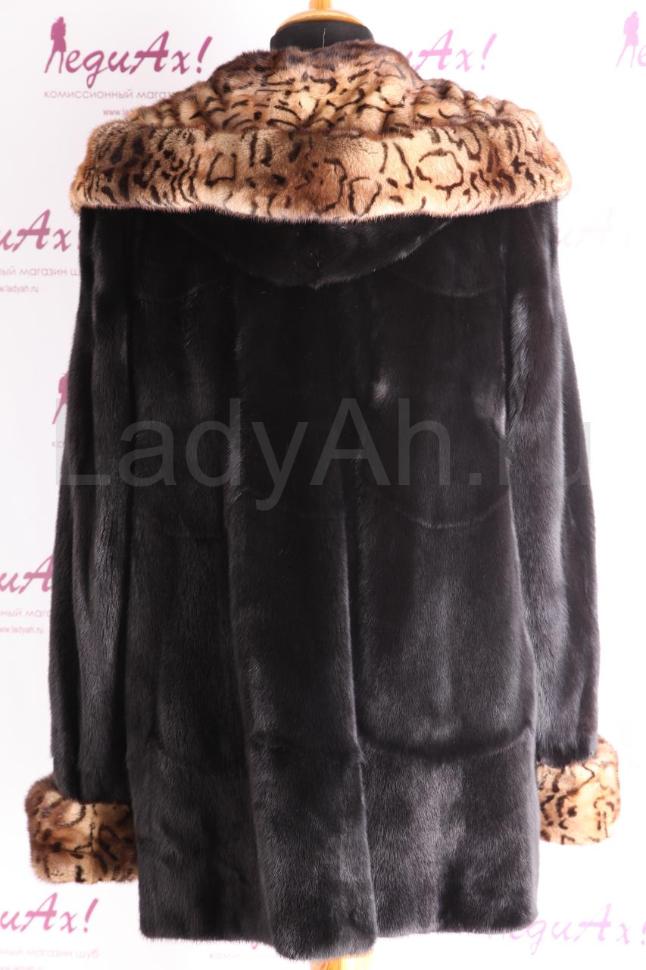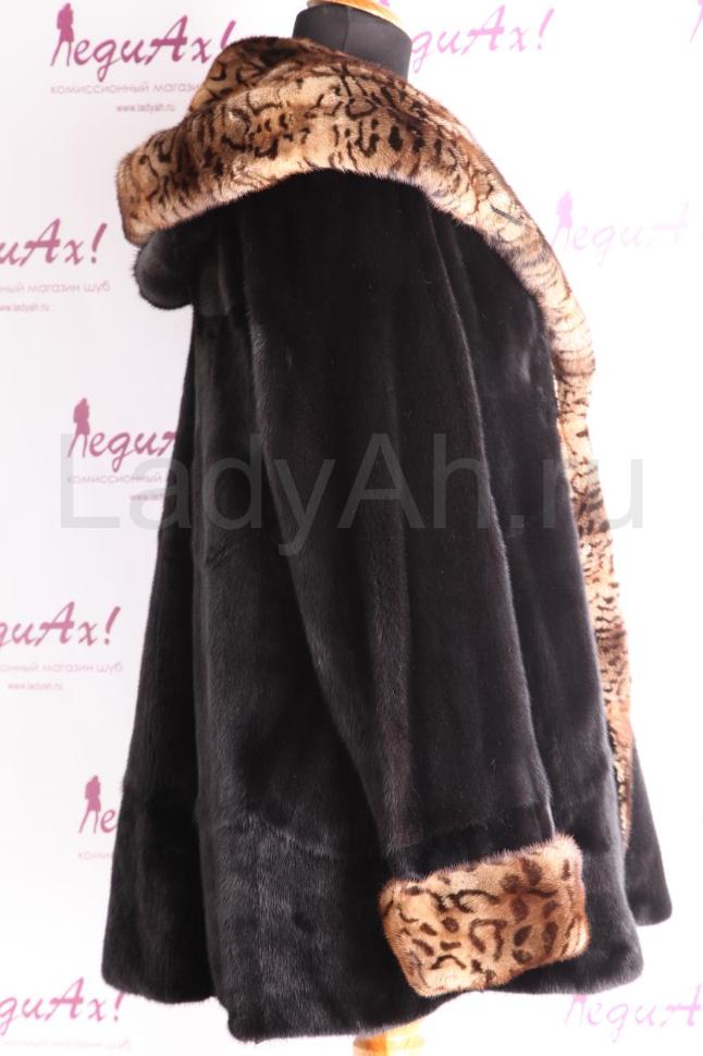 Норковый полушубок слегка расширяющегося к низу силуэта, с едва уловимыми фалдами. Рукава с отворотами, украшенными контрастной норкой с принтом "а-ля леопард". Удобный двусторонний капюшон увенчан такой же контрастной отделкой со внутренней стороны и по бортику. Мех плотный, густой, очень пластичный, с зеркальным блеском. Полушубок ловкий, ноский, удобный и красивый, прекрасно подойдет как под брюки и джинсы, так и под юбки миди- и макси-.