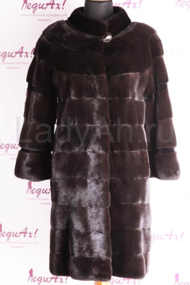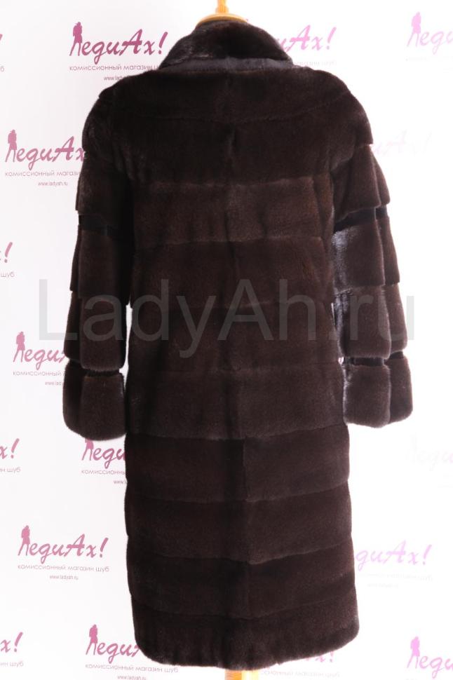Норковая шуба, фасон прямой. Лаконичный ворот шанель (не глубокий, см. фото), рукав 7/8. Мех наивысшего качества (маркировка Black Nafa) густейший, ослепительно блестящий и ощущающийся на теле, словно мягкий и дорогой бархат. Крупные поперечные пластины, идеальный подбор меха.