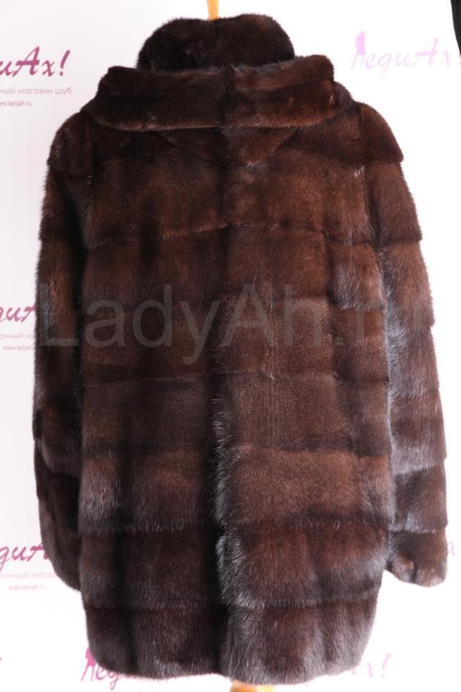 Полушубок из норки классического оттенка горький шоколад с капюшоном с отворотом. В модной и актуальной поперечной выкладке меха. Рукава трансформер - отстегиваются до длины 3/4. Мех густой, плотный, с благородным блеском.