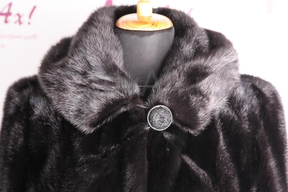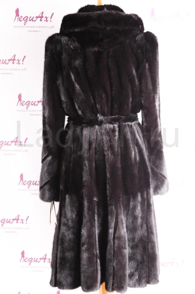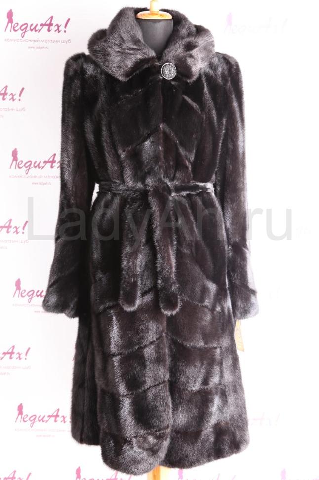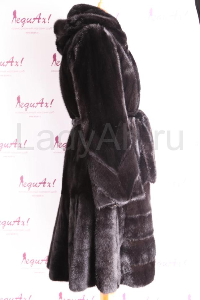 НОВАЯ норковая шуба стильного и женственного фасона платье, с выраженной юбкой, с капюшоном. Талия подчеркнута норковым поясом. Рукава, бортик и низ шубы украшены выкладкой пластин (поперечной и продольной, см. фото). Основная же часть шубы выполнена из пластин-перевертышей (остевым волоском вверх), за счет чего достигается знаменитый эффект бархата, а цвет шубы смотрится как "черный и еще чернее". Также изящества добавляет комбинация с планочками стриженой норки.
