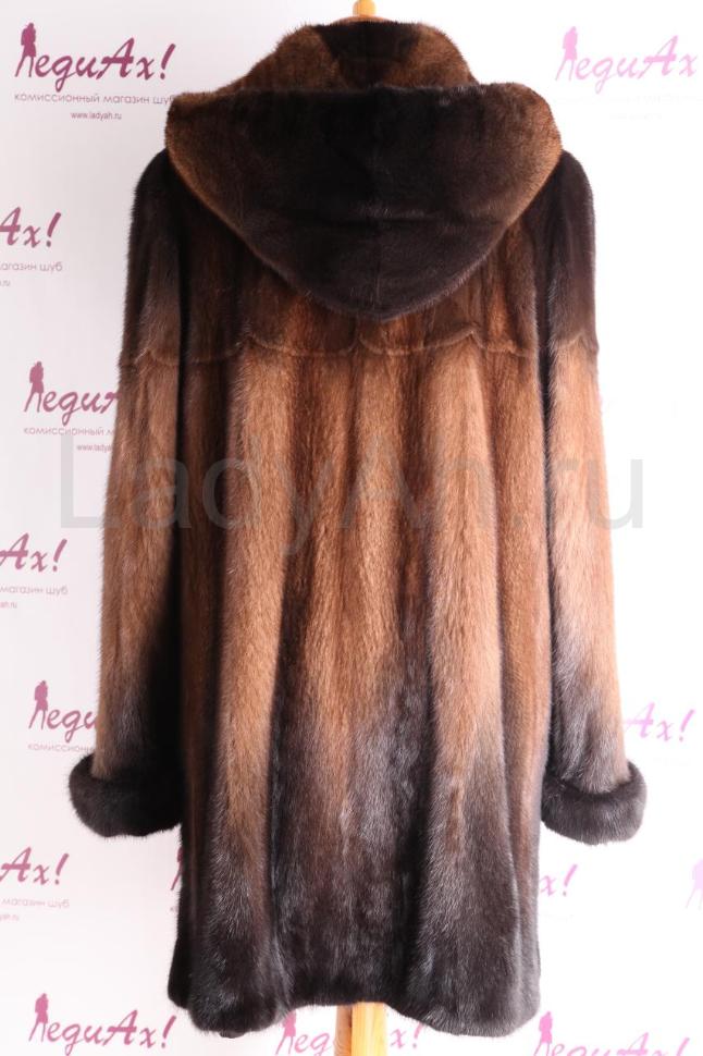 Норковая шубка, фасон прямой, с капюшоном. Рукава с отворотами, разрезы по бокам. Цвет - переходы орехового и горько-шоколадного тонов. Изобилие густого, пластичного меха с зеркальным блеском. Плавные, чуть размытые вертикальные градиенты, зрительно вытягивающие силуэт обладательницы. Шубка смотрится классически, но в тоже время стильно и современно. Фасон подчеркивает все достоинства фигуры обладательницы, а оптимальная длина делают эту шубку действительно незаменимой зимней вещью на каждый день. Изящная, в меру яркая и тёплая вещь. Сшита в роспуск, подклад открыт. Б/у, состояние отличное.