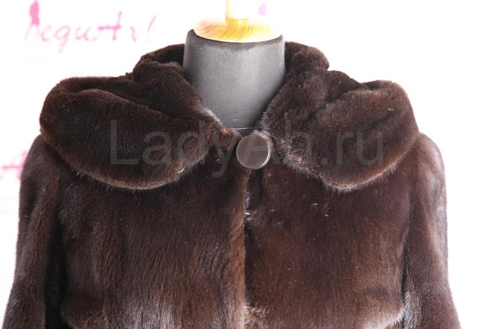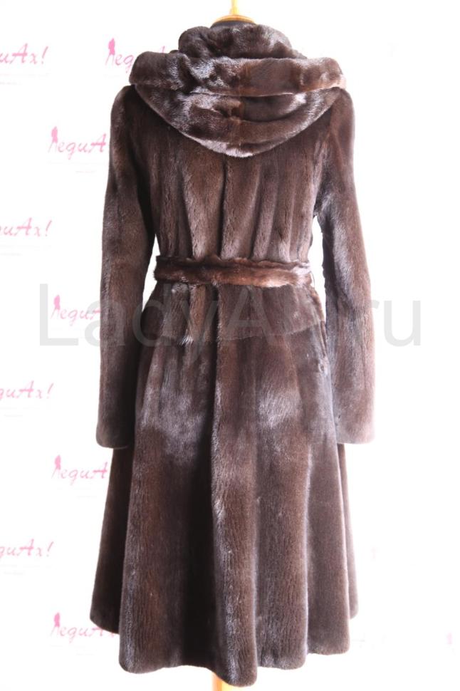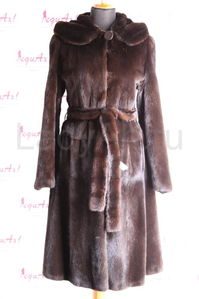Изумительная норковая классическая шуба с капюшоном, цвет черно-коричневый, нефтяной. Мех визуально похож на Blackglama, очень короткоостный, дорого смотрится. Крой слегка напоминает платье: талия подчеркнута поясом, а от него отходит слегка фалдящий низ.
