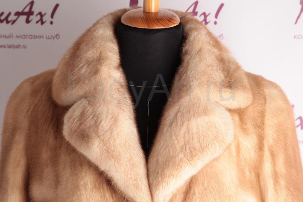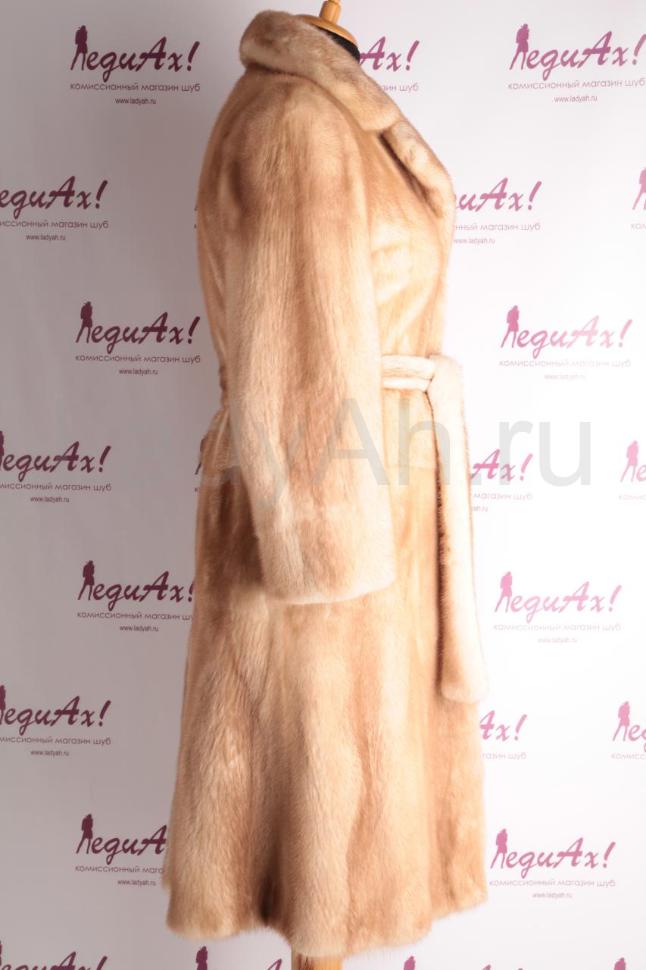 Норковая шуба кроя пальто (английский воротник, шлица сзади). Талия подчеркнута норковым поясом. Цвет шубы нарядный и при этом практичный, мех со временем не пожелтеет. Мех густой, с богатой подпушью, пластичный и блестящий. Такая шуба универсальна под юбки, платья, брюки, согреет теплом и одарит комфортом свою обладательницу. Подойдет на низкий и средний рост. Идеальная шубка для хрупкой Дюймовочки.