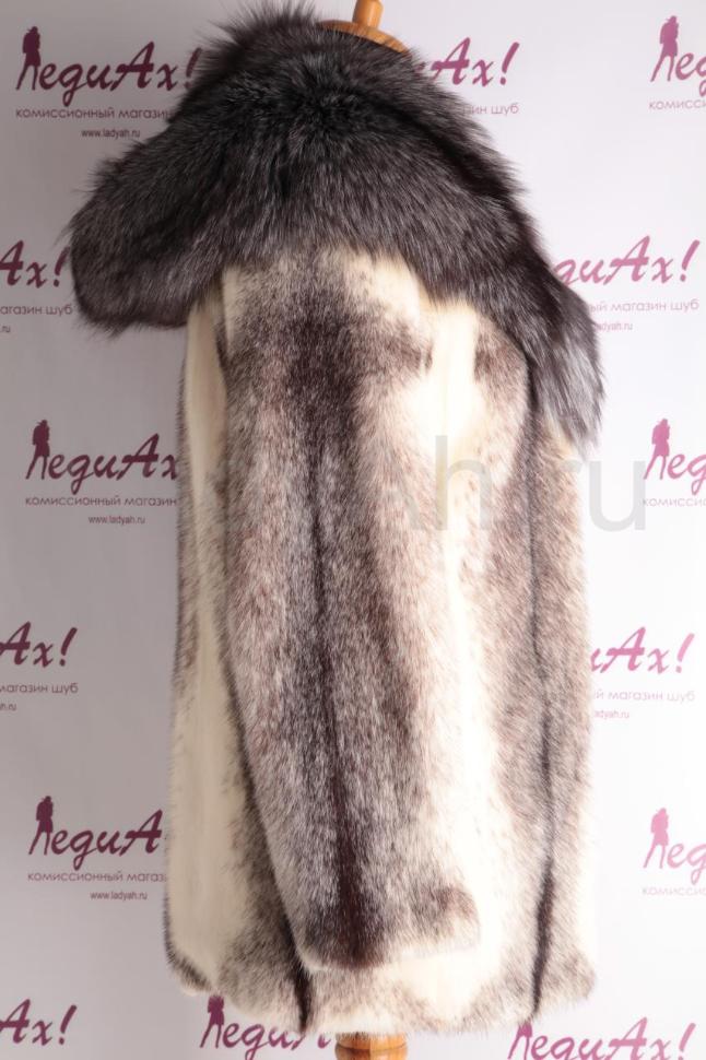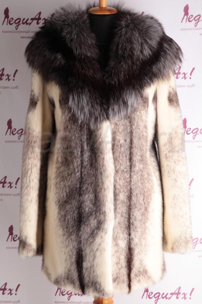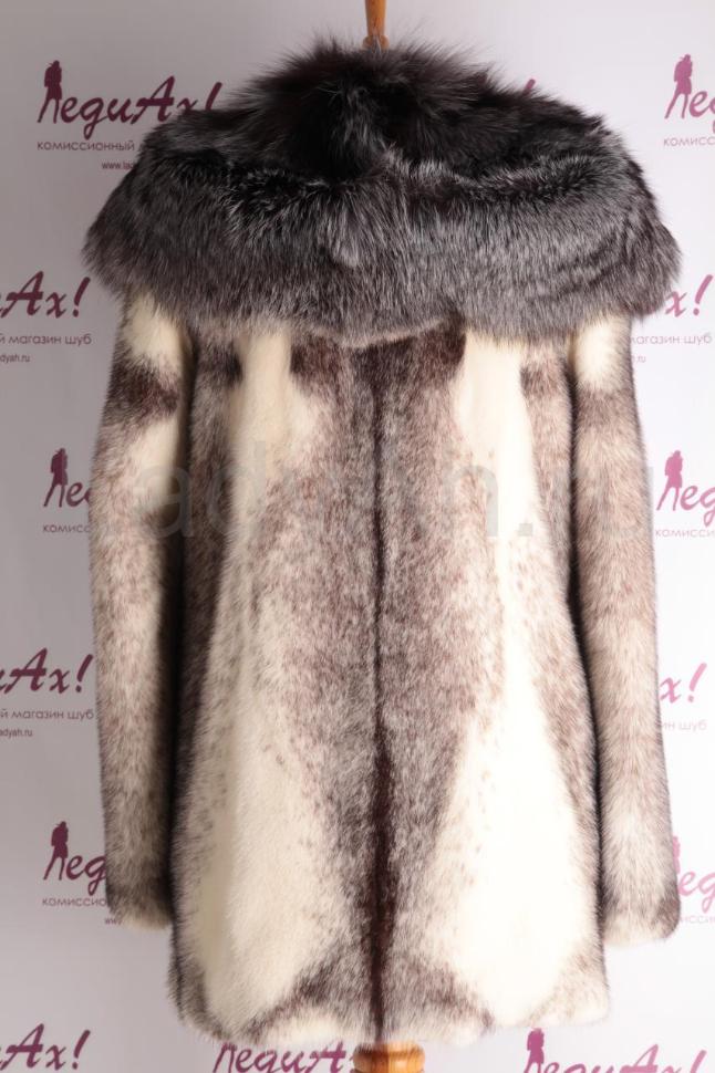 Крестовка – белая норка с вкраплениями черного цвета, подпушек белый, а некоторые остевые волоски черные. Не крашеная, не тонированная, достигается исключительно путем скрещивания разных видов норки, отсюда и название. Очень модный и современный мех, один из самых носких разновидностей норки, в меру экзотичный и очень качественный. Сшит цельными пластинами, б\у, состояние отличное.