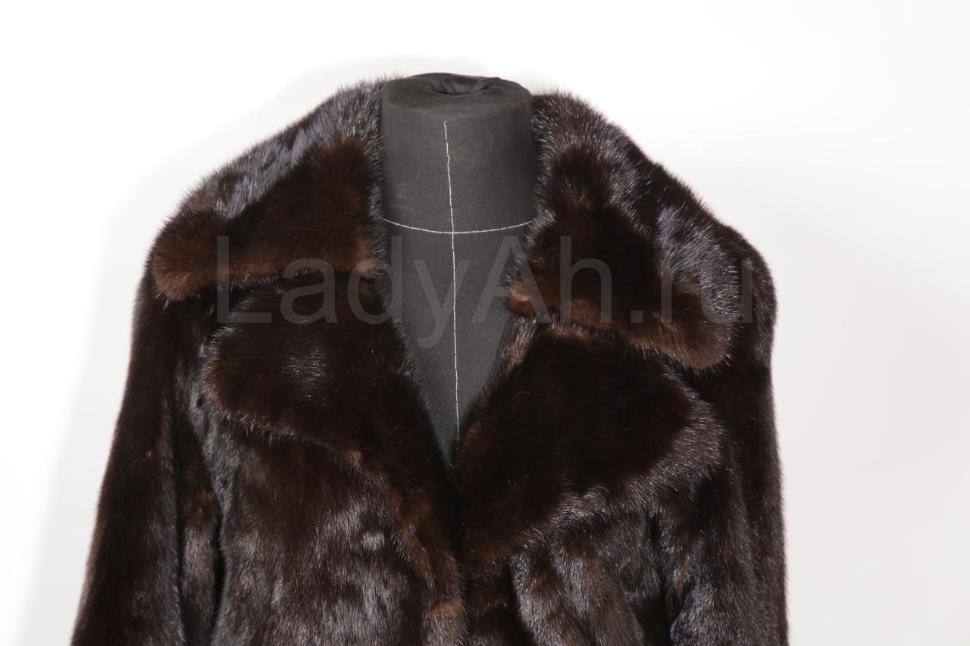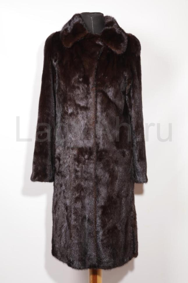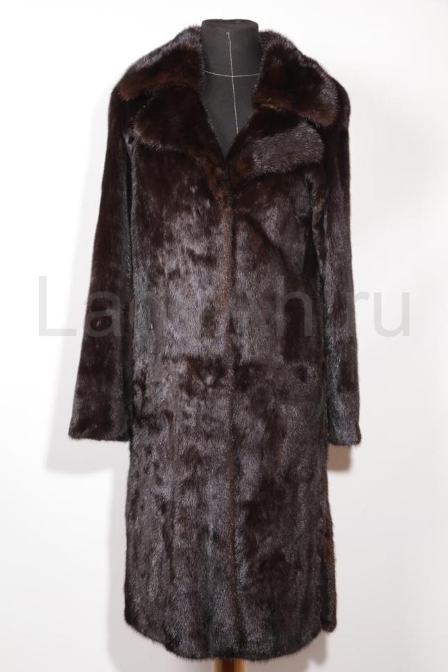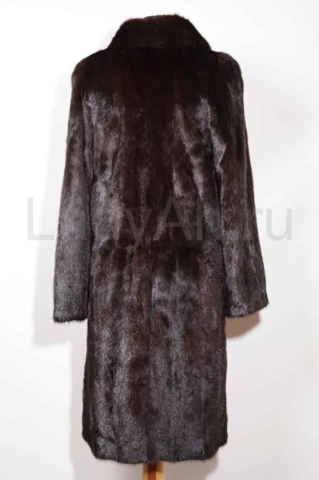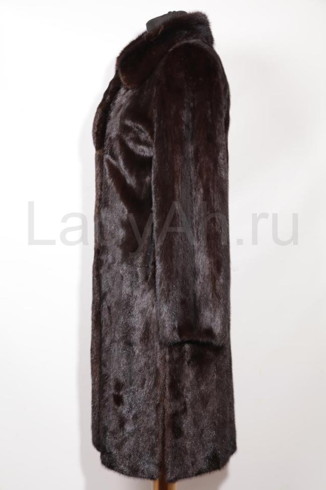 Классическая норковая шуба, прямого фасона, по бокам разрезы, английский воротник, можно носить двубортным и "наглухо". Цвет горький шоколад. Сшита цельными пластинами. Мех очень пластичный, шелковистый, блестящий.