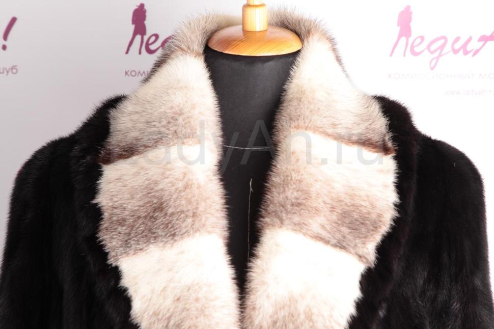 Норковый полушубок прямого кроя, с воротом манто. Изюминка полушубка - шикарная щедрая отделка воротника норкой крестовкой - вкрапления черных остевых волосков на крестовке прекрасно сочетаются с основным цветом изделия, придают полушубку шик и шарм. По низу рукавов также отделка из норки крестовки.