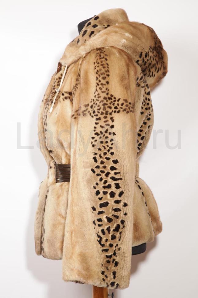 Норковый полушубок с капюшоном, прямого кроя, по талии ремень (идет в комплекте).