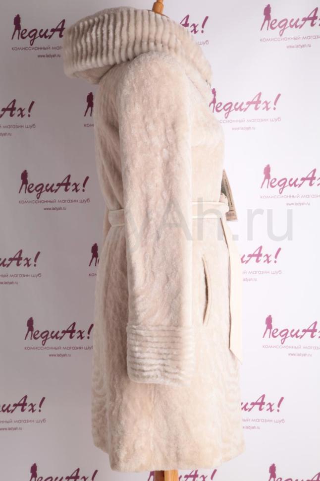 Новая мутоновая шуба в светлом ванильном оттенке, с капюшоном с отворотом. Талия подчеркнута мутоновым поясом. Фасон прямой.