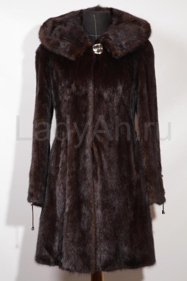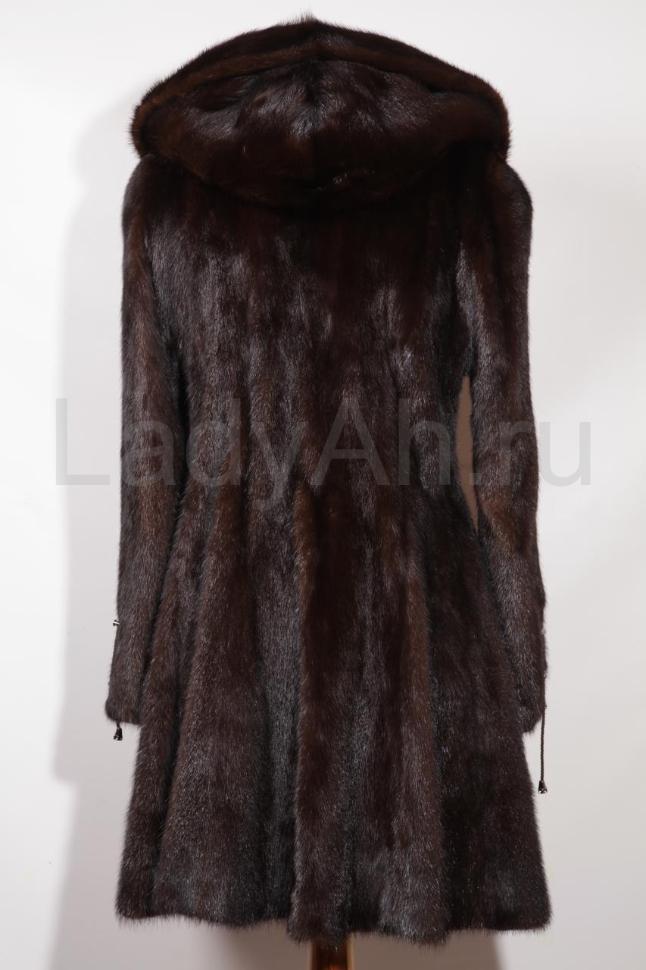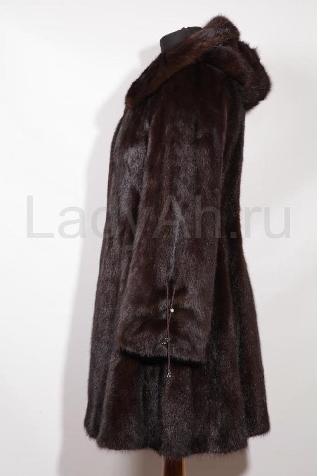 Норковая шуба с капюшоном, от талии отрезная, на поясе и на рукавах кулиска.