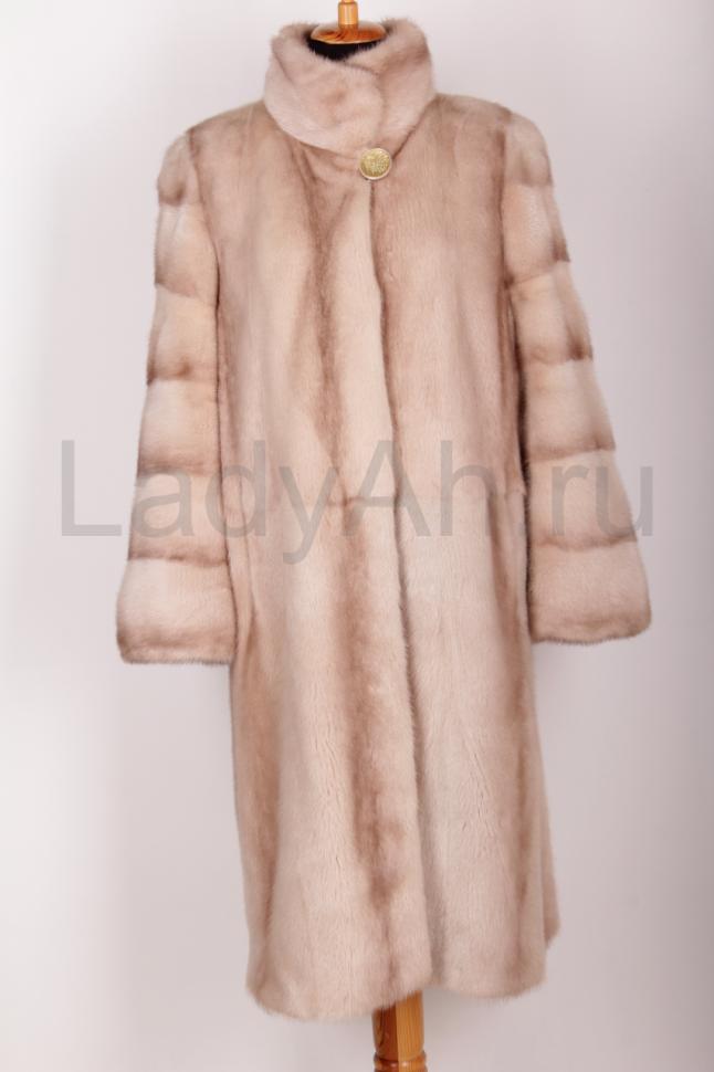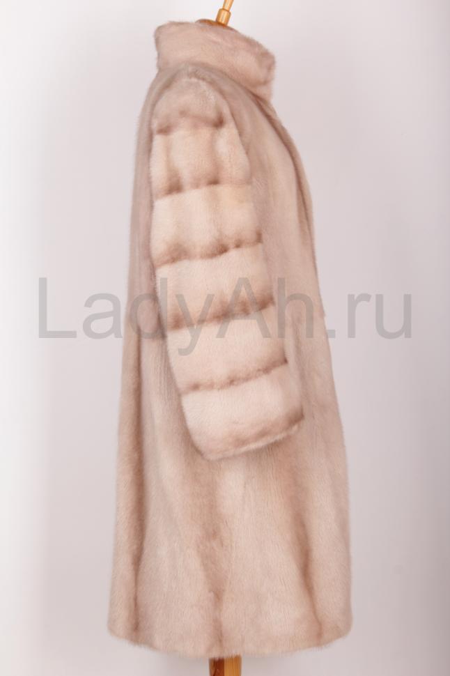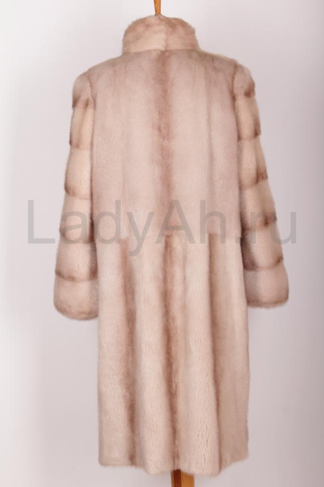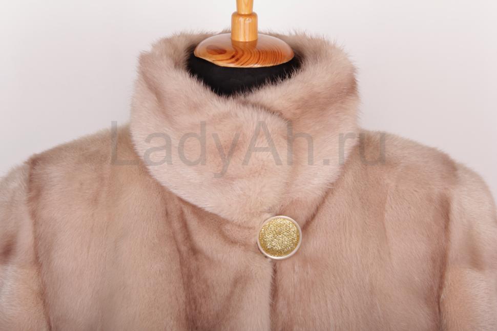 Изысканная норковая шуба прямого фасона, сшита цельными пластинами, с воротником стойка в красивом и нежном цвете пудра. Создает утонченный и элегантный образ.