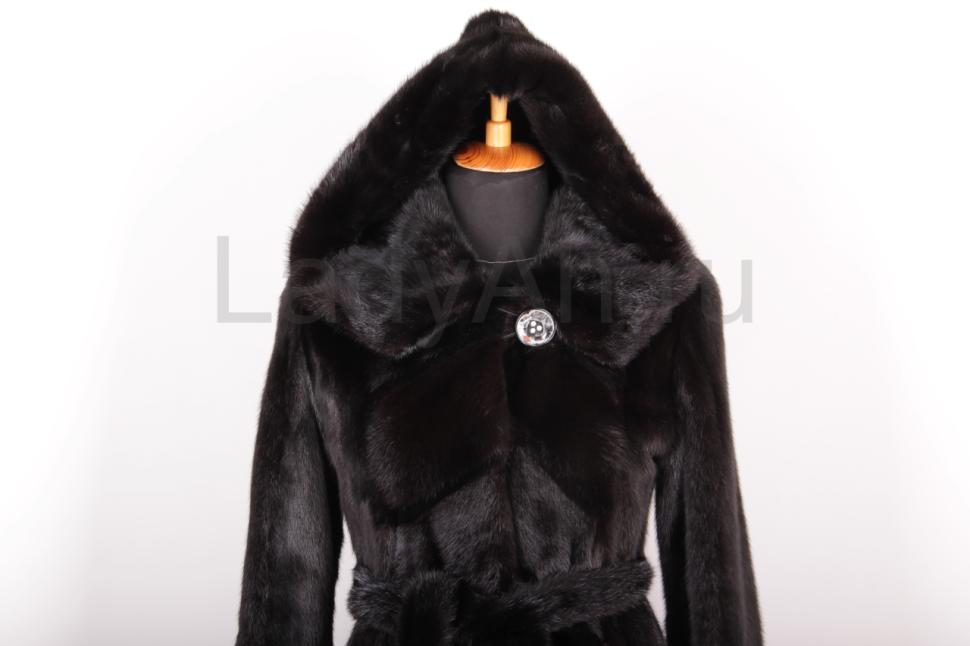 Элегантная норковая шуба с капюшоном и меховым поясом. Фасон платье.