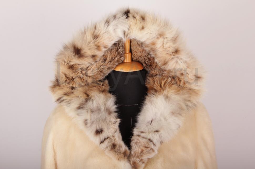 Изысканная классика прямого кроя в диалоге с дикой природой. Нежный жемчужный оттенок норки подсвечивает лицо, а пышный капюшон из натуральной рыси обрамляет его мягким сиянием.