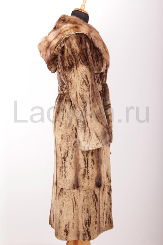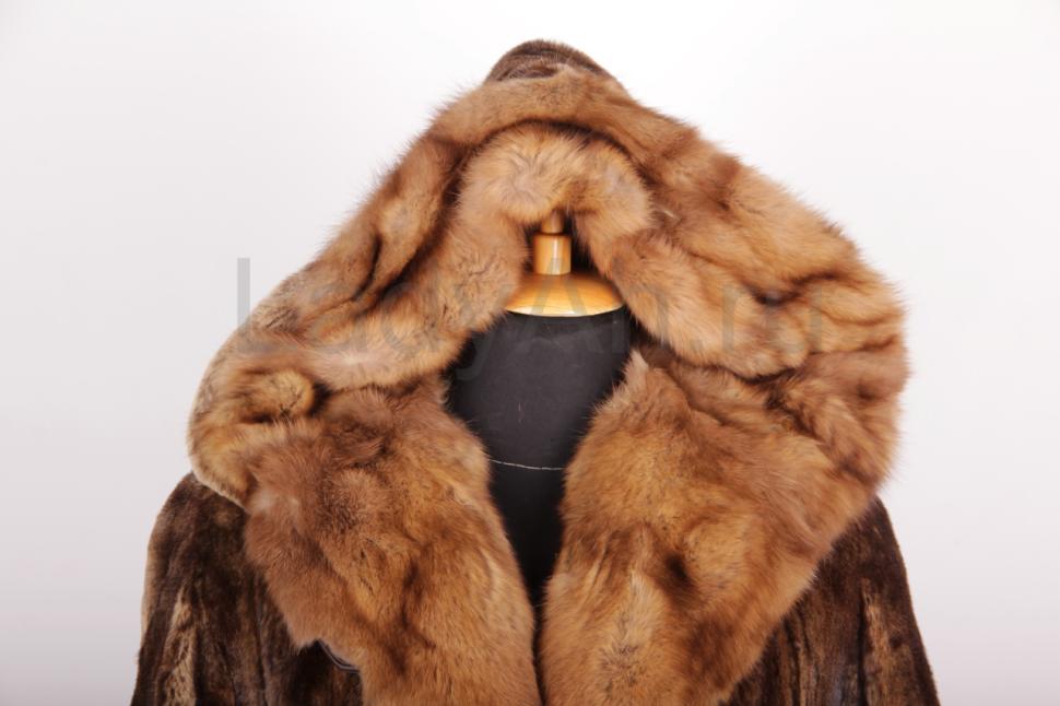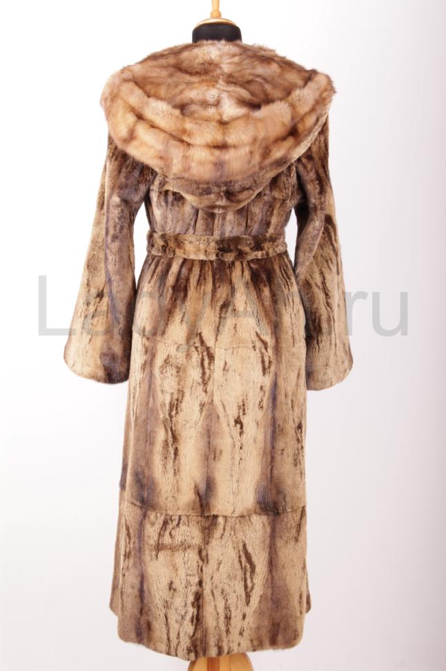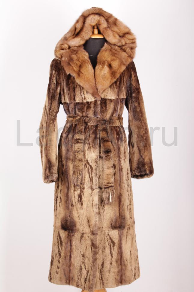Норковая шуба, прямого кроя, полустрижка, с меховым поясом, на конце сделан как кисточки с капюшоном из соболя. Расцветка, принт/трафарет кофейных оттенков. Легкая и универсальная, на каждый день и на выход.