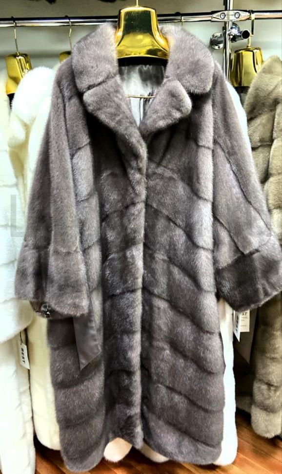 Норковая шуба прямого кроя, выкладка меха диагональ, английский воротник, цвет сильвер.