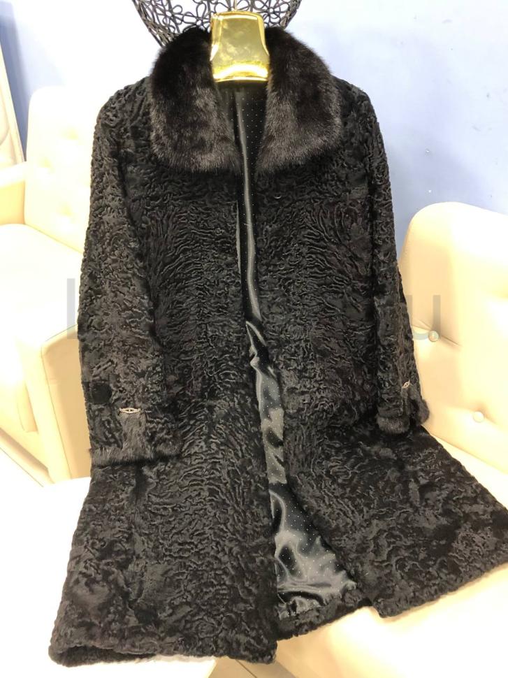Бухарский каракуль (каракульча) ценится выше обычного за свой плотный, упругий завиток и характерный рисунок. В паре с воротником из норки эта модель выглядит скульптурно и богато.