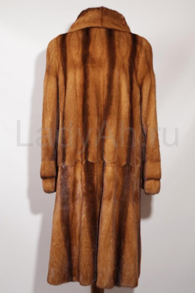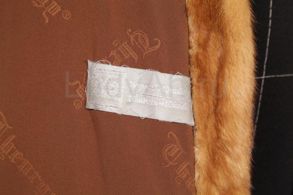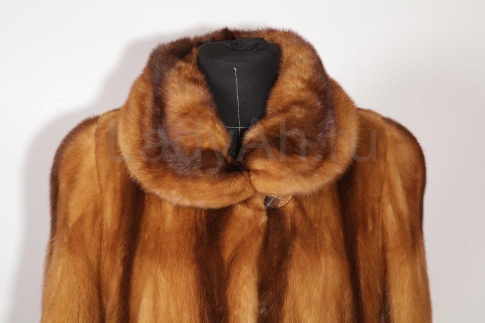 Слегка расширяющаяся к низу шубка с расклешенными рукавами и полукруглым отложным воротом. Цвет- переливы светлых и тёмных янтарных тонов. Шубка смотрится просто восхитительно, ласкает взгляд блеском отборного меха, который очень приятен и мягок на ощупь. Маркировка "Saga Mink". Сшита цельными пластинами, выделка прекрасного качества, подклад открыт.