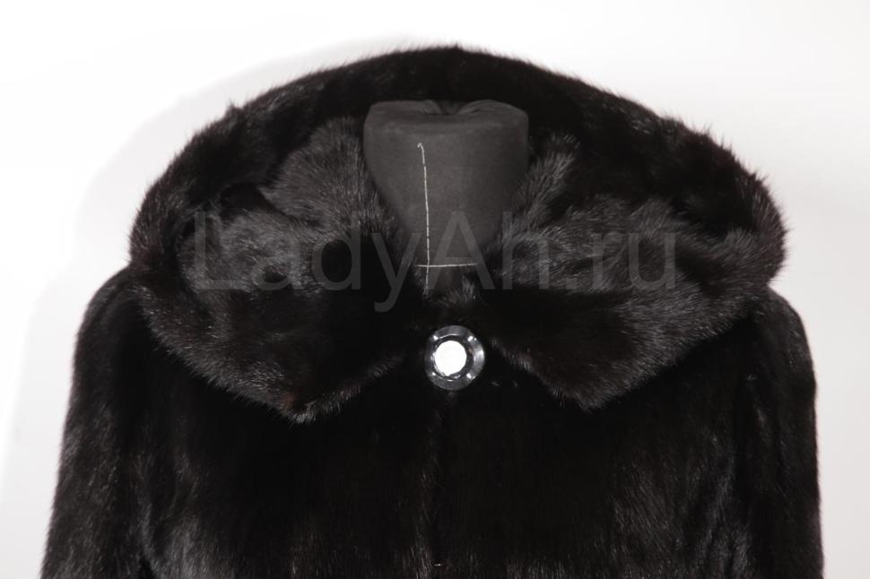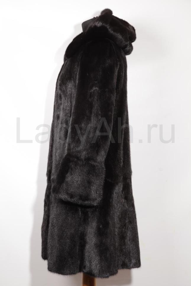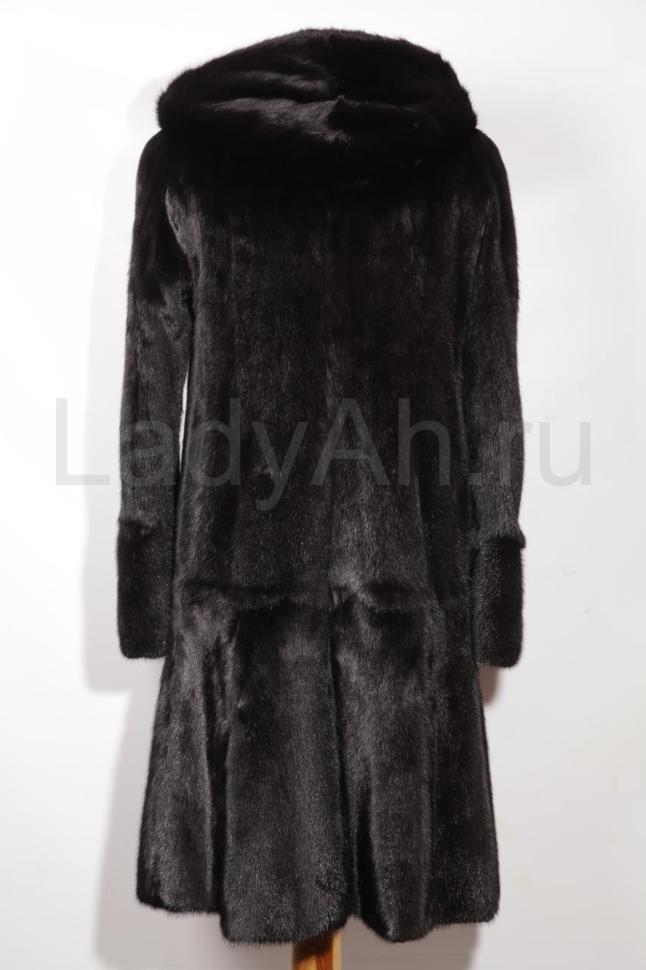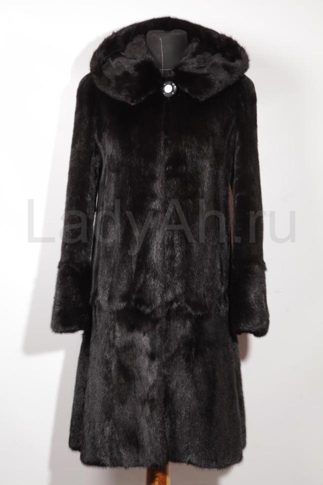 Норковая шуба с капюшоном, прямого фасона, рукава слегка расклешенные, низ юбки в виде годе.