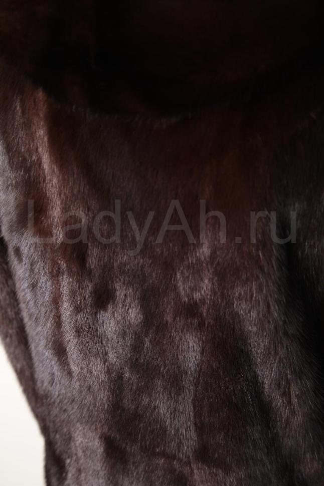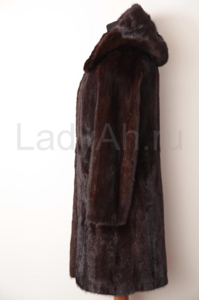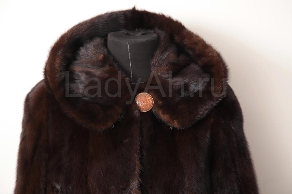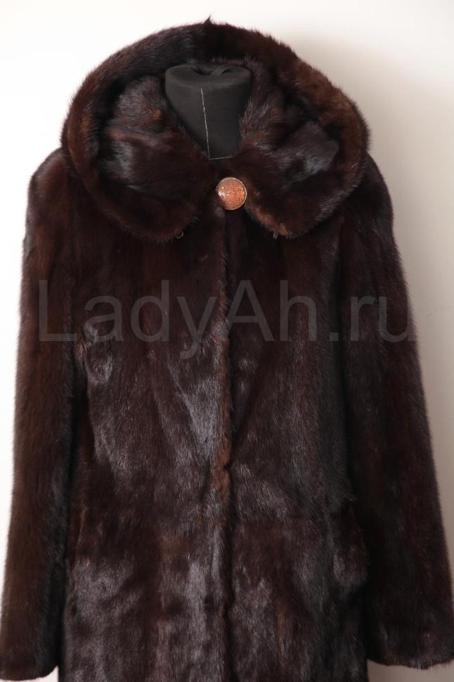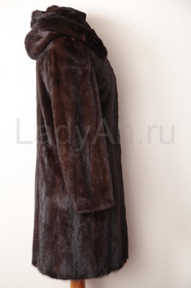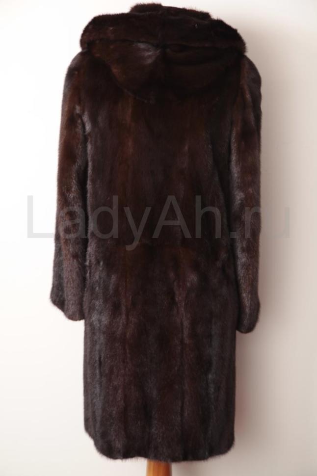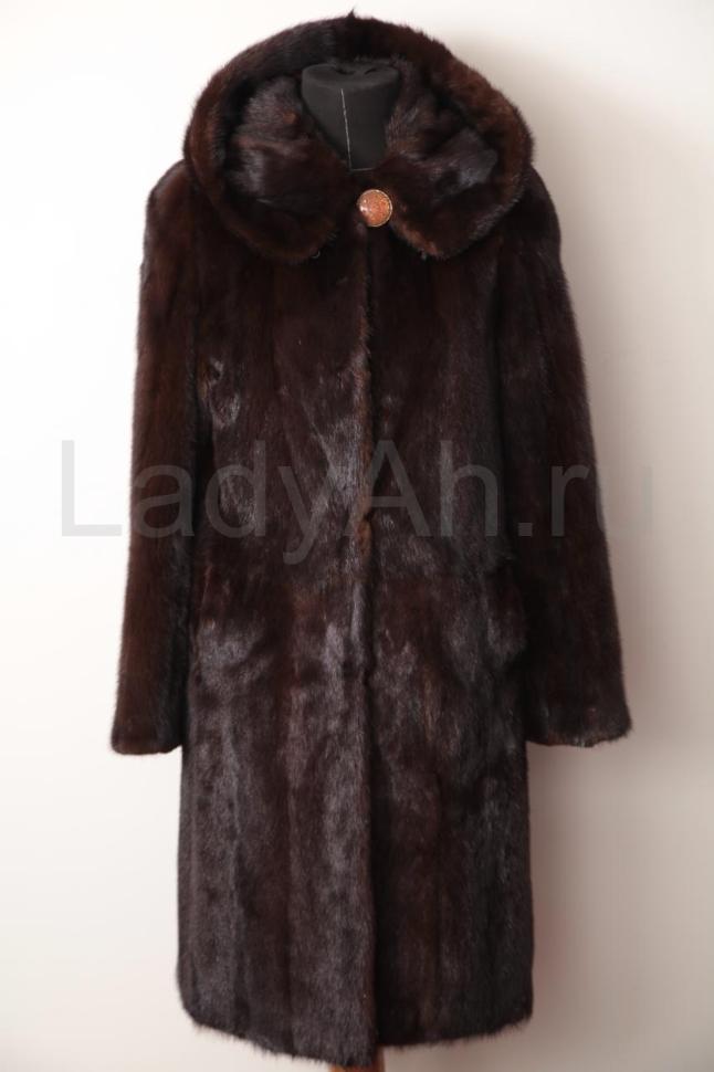 Классическая цельная норковая шуба с двусторонним норковым капюшоном, цвет горький шоколад. Состояние в целом хорошее, б/у, после реставрации.